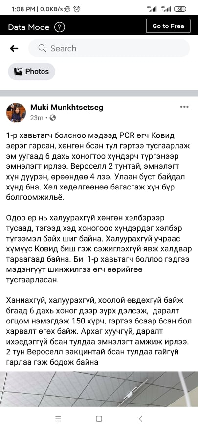 Тэрбээр “Нэгдүгээр хавьтагч болсноо мэдээд PCR өгч, ковид эерэг гарсан. Хөнгөн байсан тул гэртээ тусгаарлаж эм уугаад зургаа дахь хоногтоо хүндэрч, түргэнээр эмнэлэгт ирлээ. Вероселл хоёр тунтай, эмнэлэгт хүн дүүрэн. Өрөөндөө дөрвүүлээ. Улаан бүсэд байдал хүнд байна. Хөл хөдөлгөөнөө багасгаж хүн бүр болгоомжилъё" гэжээ.