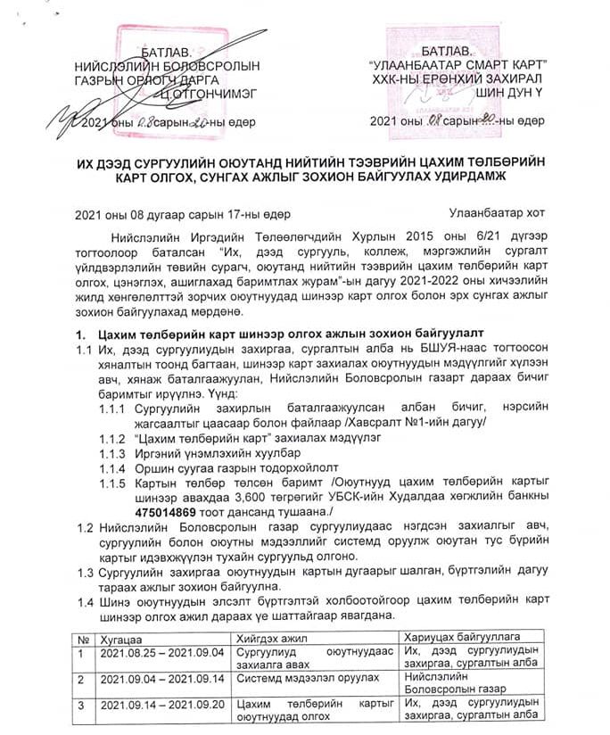 Шинээр карт захиалах оюутнууд өөрсдийн харьяа их, дээд сургуулийнхаа сургалтын албанд наймдугаар сарын 25-наас есдүгээр сарын 4-нийг хүртэл хүсэлтээ өгөх юм байна. Харин их, дээд сургуулиуд БШУЯ-наас тогтоосон хяналтын тоонд багтаан есдүгээр сарын дөрөвнөөс 14-ны хооронд дээрх мэдээллийг системд оруулснаар 14-нөөс эхэлж картаа авах боломжтой болно. Оюутанд зориулсан цахим төлбөрийн картыг шинээр авах үнэ 3,600 төгрөг байх юм.