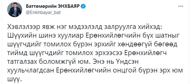 Тэгвэл энэ талаар УИХ-ын гишүүн Б.Энхбаяр байр сууриа илэрхийлжээ. Тэрбээр "Хэвлэлээр явж нэг мэдээлэлд залруулга хийхэд, Шүүхийн шинэ хуулиар Ерөнхийлөгчийн бүх шатныг шүүгчдийг томилох бүрэн эрхийг хөндөөгүй бөгөөд тиймд шүүгчдийг томилох эрхээсээ Ерөнхийлөгч татгалзах боломжгүй юм. Энэ нь Үндсэн хуульчлагдсан Ерөнхийлөгчийн онцгой бүрэн эрх юм шүү" гэжээ.