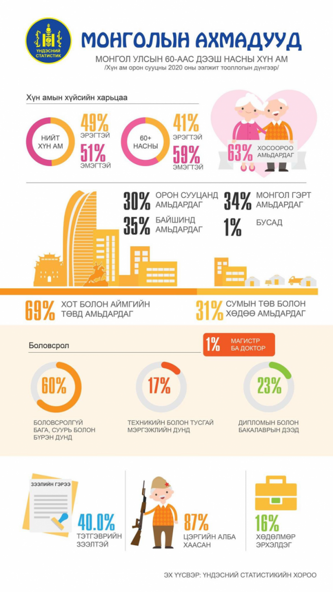 Манай улсын хүн амын 7.3 хувь буюу 232 мянга нь 60-аас дээш насны ахмадууд байна. Тэдний 41 хувь нь эрэгтэй, 59 хувь нь эмэгтэй. Нийт ахмадын 69 хувь нь хот болон аймгийн төвд амьдардаг бол үлдсэн 31 хувь нь сумын төв болон хөдөө орон нутагт амьдарч байна. Нийт ахмадын 40 хувь нь тэтгэврийн зээлтэй байна.