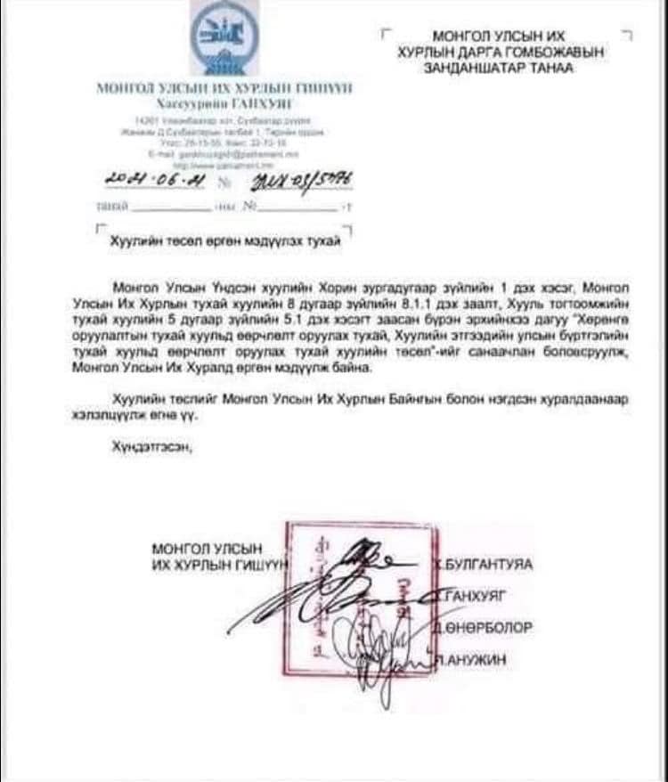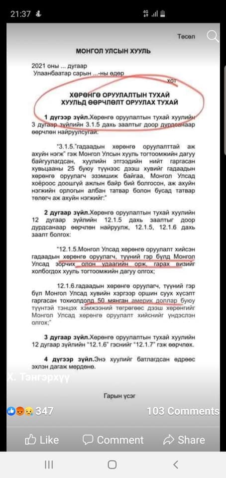 Хууль санаачилсан, өргөн барьсан гэж гарын үсгээ зурсан УИХ-ын гишүүн Д.Өнөрболор, П.Анужин нарын гишүүд уснаас хуурай гарах гэсэндээ тэр үү цахим орчинд яаруу, сандруу мэдэгдэл гаргаж, хуулийн төсөлд хуруу хөдөлгөөгүй гэдгээ илэрхийлж харагдсан. Харин хуулийн төслөө УИХ-ын даргад өргөн барьсан Х.Ганхуяг гишүүн Үндэсний аюулгүй байдалд халдаагүй хуулийн төслөө хамгаална гэж улайрав.