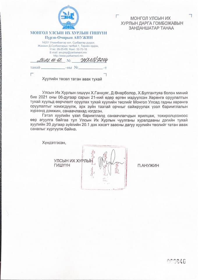 Улмаар хуулийн төсөл өргөн мэдүүлсэн П.Анужин, Д.Өнөрболор нарын гишүүд хуулийн төсөлд гарын үсэг зураагүй, анх боловсруулахад ийм заалт байгаагүй гэдэг байр суурийг илэрхийлээд буй. Тэгвэл УИХ-ын гишүүн П.Анужин хуулийн төслийг эргүүлэн татах санал гаргаснаа мэдэгджээ. Тэрбээр "Хууль санаачлагч, боловсруулагч Х.Ганхуяг гишүүн, хуулийн үзэл баримтлал, санаачлагчдын ярилцаж тохиролцсоноос өөр агуулга бүхий заалт оруулсан тул, хуулийн төслийг татан авах саналаа хүргүүллээ. Гэвч, хууль санаачлагчдийн олонхын саналаар төсөл эргүүлэн татагддаг тул бусад гишүүдийн саналыг харах үлдлээ" гэжээ.