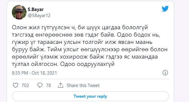 Ерөнхий сайд асан С.Баяр өөрийн цахим хуудсаараа дамжуулан өөртэй нь холбоотой мэдээлэл, гүтгэлгэлийн асуудалд хариуцлага тооцох болно гэдгээ мэдэгджээ.