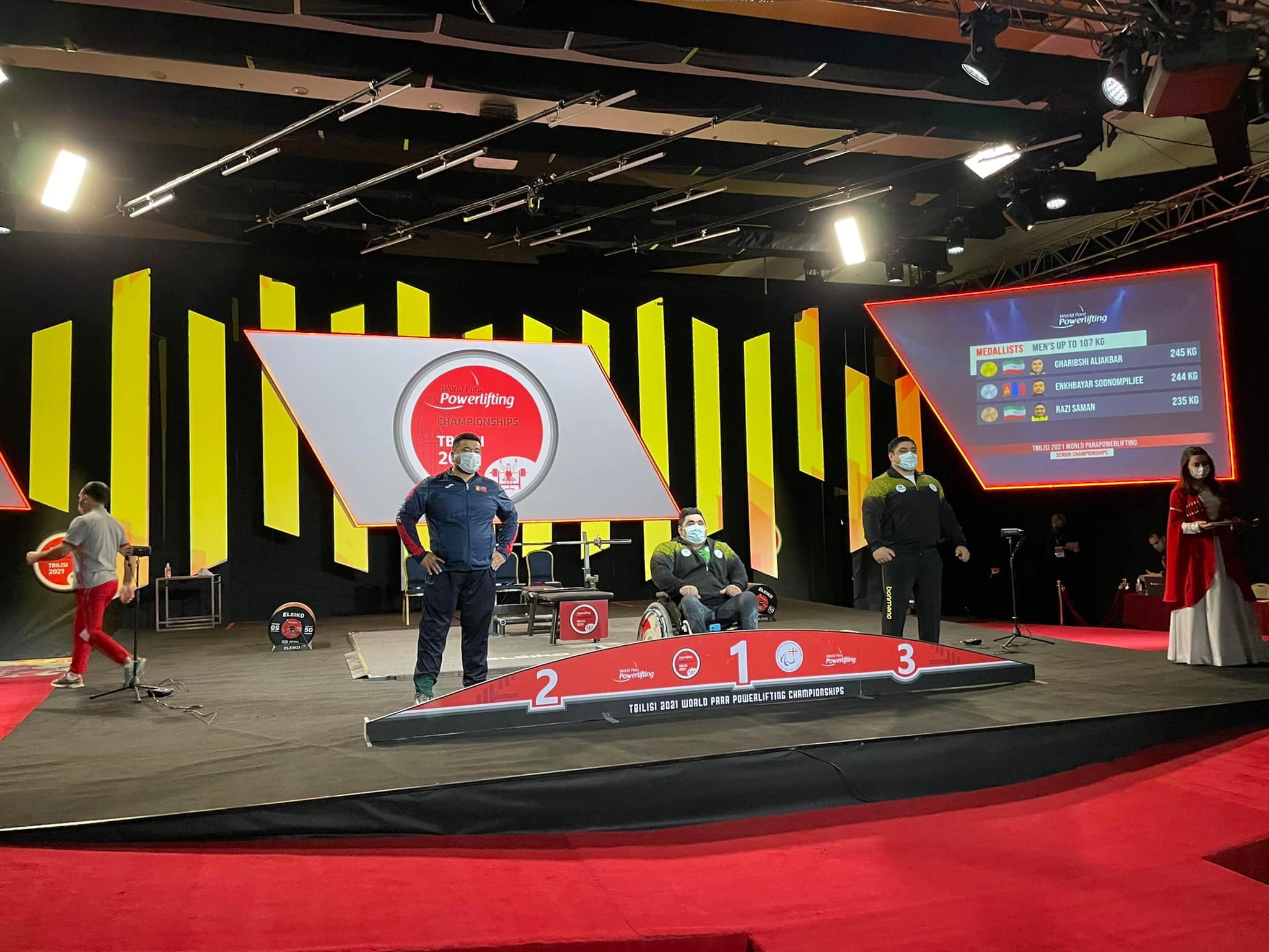 Тэрбээр эрэгтэйчүүдийн 107 кг-ын жинд Иран, Узбeкистан, Малайз, Бразил, Саудын Араб, Бахрайн зэрэг 20 орчим орны тамирчидтай өрсөлдсөнөөс алт, хүрэл мeдалийг Ираны тамирчид хүртсэн юм.