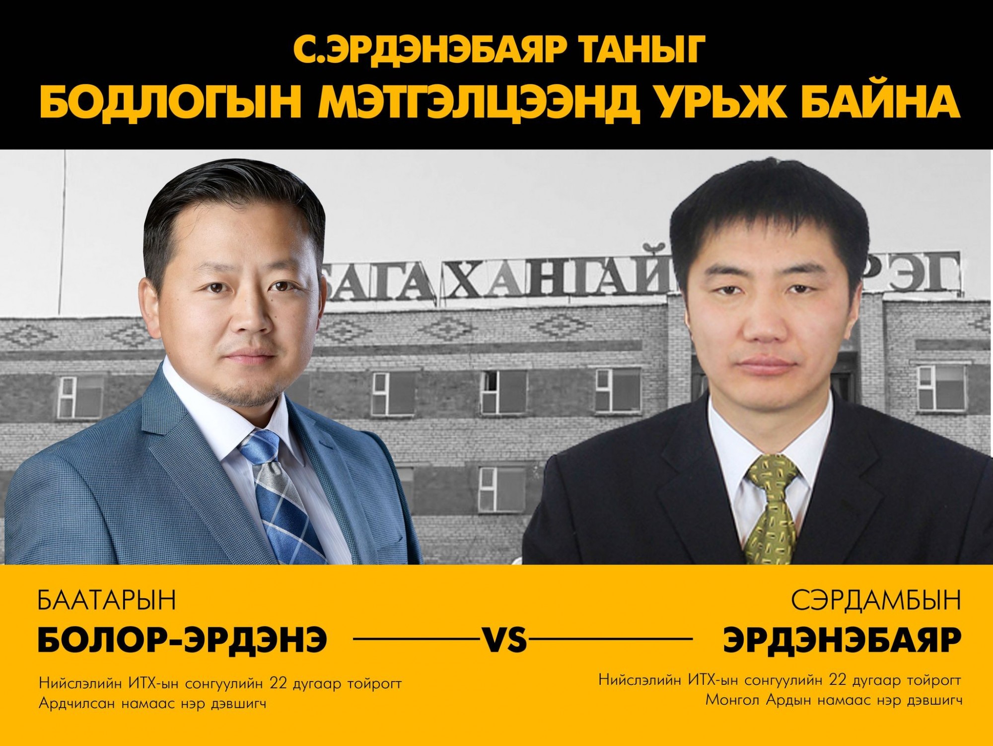 Баатарын Болор-Эрдэнийн хувьд орон нутгийн хөгжлийн төлөө бодлогоо уралдуулж, үзэл бодлоороо мэтгэлцэх нь зүйтэй гэж үзэн, дахин хүсэлт илгээж, мэтгэлцэх цаг, өдрөө товлох санал хүргүүлжээ. Багахангай дүүрэгт сүүлийн 30 жил МАН дангаар засаг барьж буй. С.Эрдэнэбаярын хувьд Багахангай дүүрэгт 16 жил намд зүтгэсэн бөгөөд сүүлийн найман жил дүүргийн Засаг даргаар ажилласан аж.