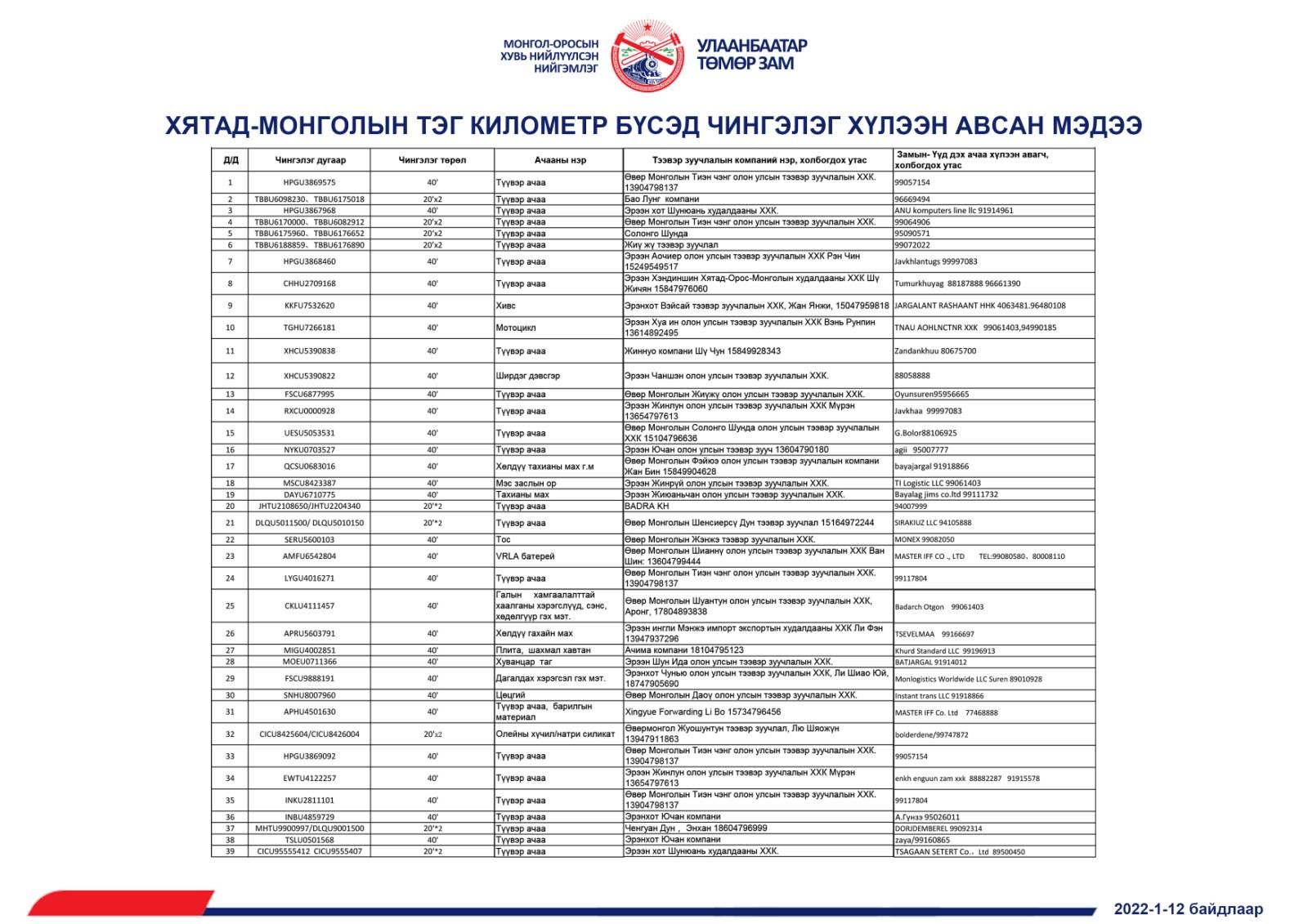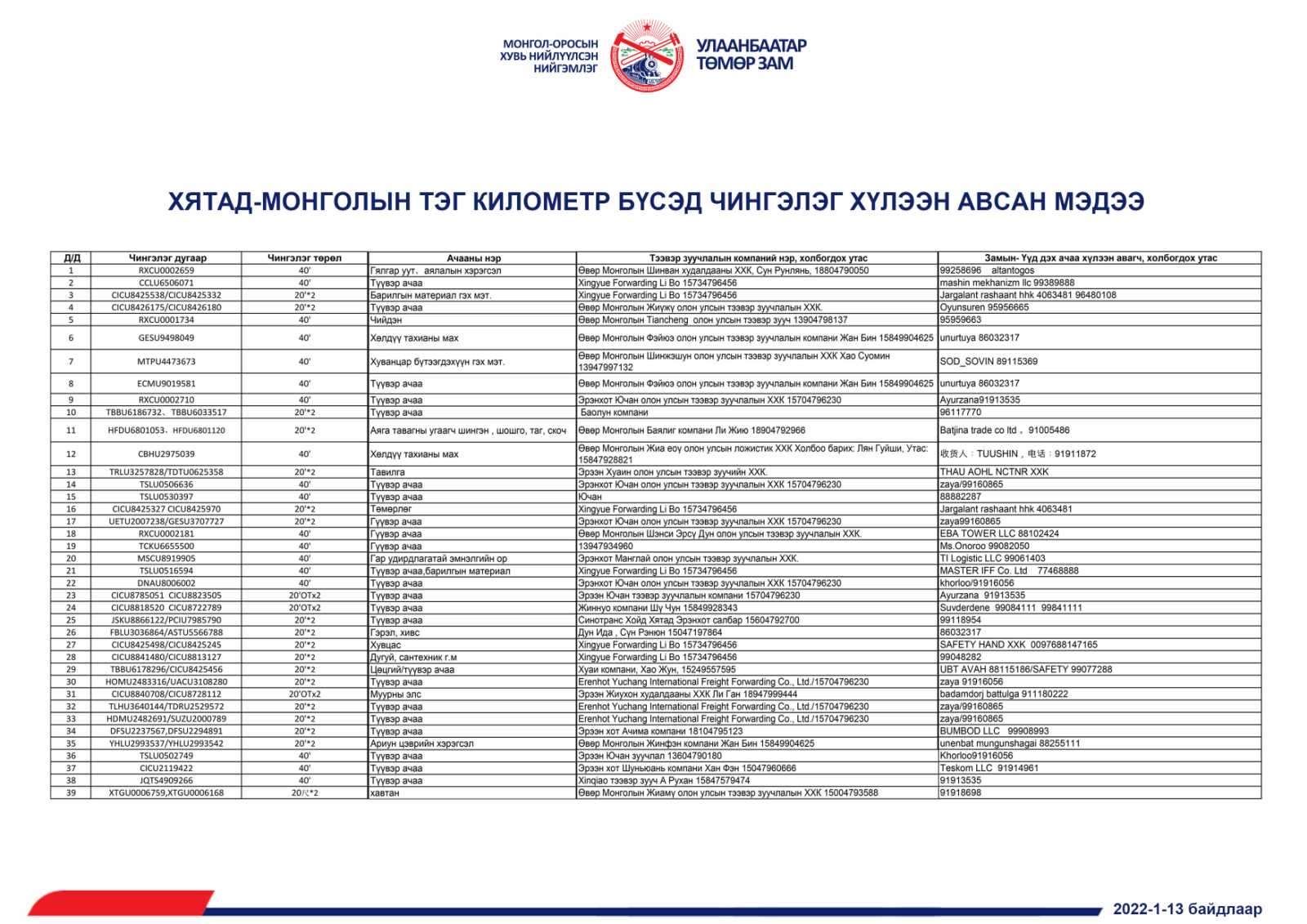 БНХАУ-ын хилийн Эрээн боомтод гурван сар орчим саатсан ачаа тээврийг хилээр нэвтрүүлж байна. Эрээн хотоос Замын-Үүд боомтоор 2022 оны нэгдүгээр сарын 12-нд 49 чингэлэг бүхий 1000 гаруй тонн ачаа барааг, нэгдүгээр сарын 13-нд 60 чингэлэг ачаа, бараа бүтээгдэхүүнийг татан авсан. Харин чингэлэг ачаагаар ямар бараа бүтээгдэхүүн орж ирсэн талаар УБТЗ-аас мэдээллээ. “ Энэ сарын 11-13-нд хилийн 0 цэгээс 58 ширхэг 40 тоннын чингэлэг, 74 ширхэг 20 тоннын чингэлэгтэй эм, эмнэлгийн хэрэгсэл, барилга, сантехник, түүвэр болон өргөн хэрэглээний бараа бүтээгдэхүүнийг татан авчээ. Тодруулбал хувцас, гялгар уут, скоч, таг, тахиа, гахайн мах, муурын элс зэрэг байна.