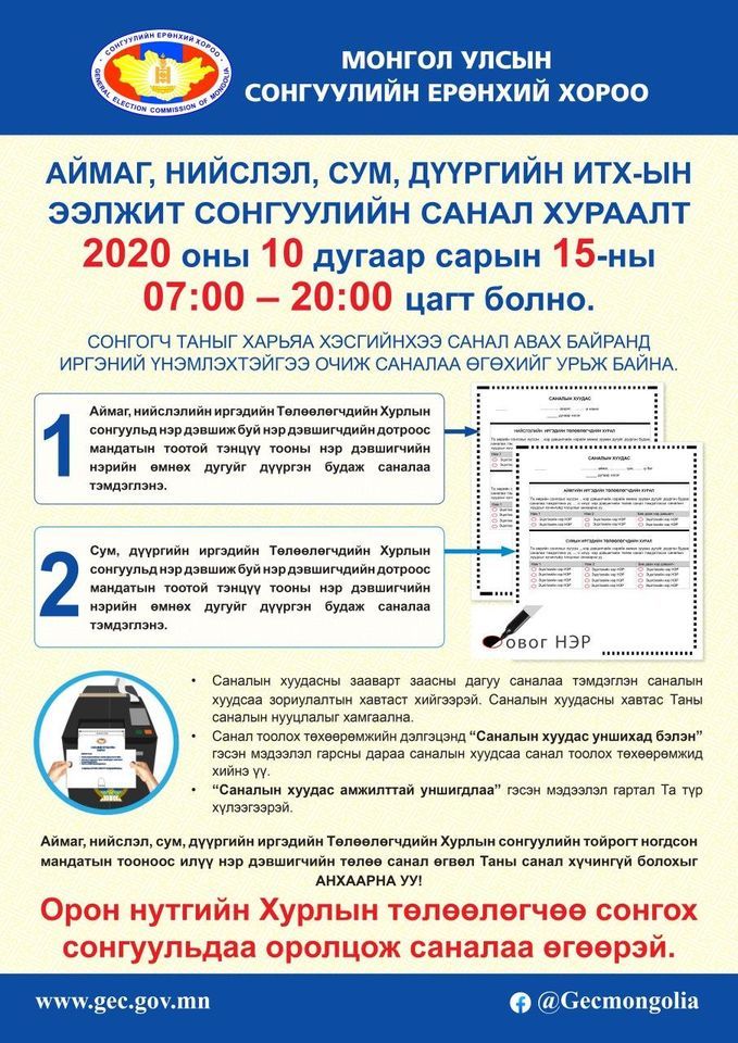 Санал хураалт өнөөдөр 20.00 цаг хүртэл явагдах юм. Мөн зөөврийн дөрвөн хайрцгаар иргэдийн саналыг авна. Иргэн та сонгуулийн санал өгөх байраа энд дарж мэдэх боломжтой.