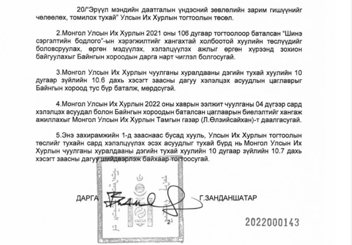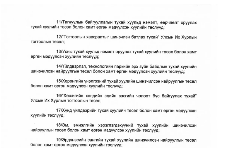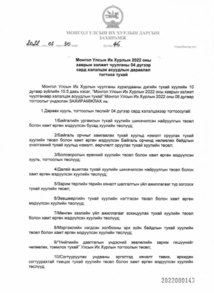 УИХ-ын чуулганы хуралдааны дэгийн тухай хуульд УИХ-ын чуулганаар хэлэлцэх хууль, тогтоолын төслийг УИХ-ын дарга сар бүр баталж байхаар заасан байдаг. Энэ дагуу “Монгол Улсын Их Хурлын 2022 оны хаврын ээлжит чуулганы дөрөвдүгээр сард хэлэлцэх асуудлын дараалал тогтоох тухай” захирамжид дараах хууль, тогтоолын төслийг хэлэлцэхээр товлосон байна.
