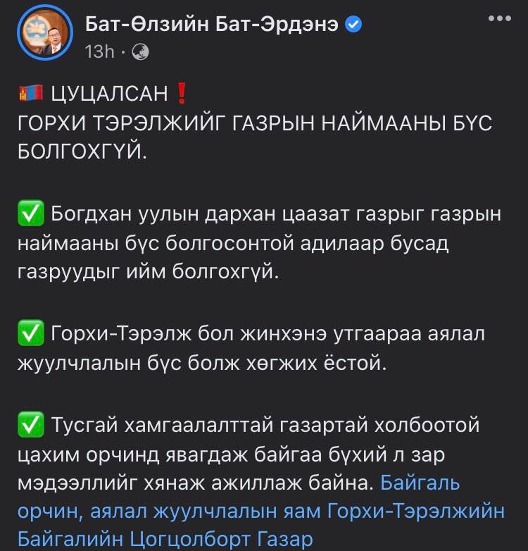 | Б.БАТ-ЭРДЭНЭ: ГОРХИ ТЭРЭЛЖИЙН ГАЗРЫГ НАЙМААНЫ ГАЗАР БОЛГОХГҮЙ |