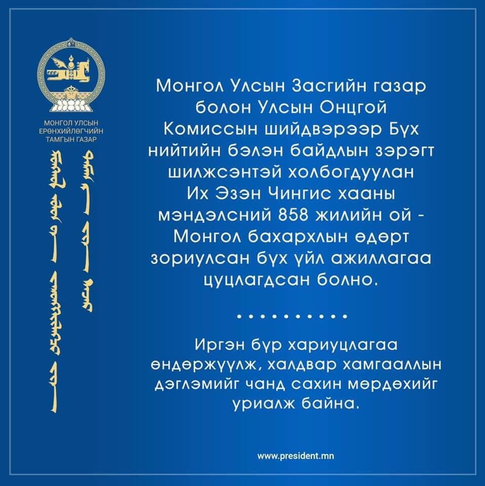 Билгийн тооллын өвлийн тэргүүн сарын шинийн 1-н, Их эзэн Чингис хааны мэндэлсний 858 жилийн ой, Монгол бахархлын өдөр өнөөдөр тохиож байна.