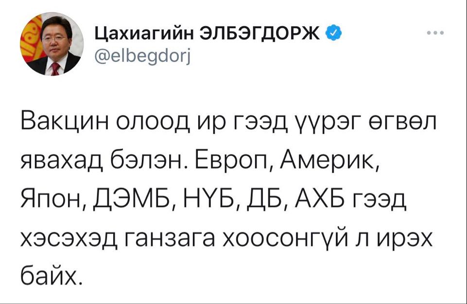 Дэлхий нийт Ковид-19 халдварын эсрэг вакциныг хүлээж байна. Манай улс ДЭМБ-аас хэрэгжүүлж буй хөтөлбөрт хамрагдаж вакцин авах хүсэлтээ өгөөд буй юм. Ингэхдээ хүн амын 60 хувьд нь вакцин хийх захиалгыг өгчээ. Харин үлдсэн 40 хувь буюу хүүхдүүдэд вакцин хийхгүй гэсэн саналтай байгааг Сангийн сайд Ч.Хүрэлбаатар хэлсэн. Одоогоор батлагдсан вакцин хараахан гараагүй байгаа. Вакцин бэлэн болсон тохиолдолд мөнгөтэй улс орнууд түрүүлээд аваах магаадлал өндөр байгаа юм. Энэ талаар УИХ-ын гишүүд байр сууриа илэрхийлж байна. Тухайлбал, манай улсад Вакцин орж ирэх гэж удах юм байна, заавал ДЭМБ-ыг харах шаардлага байхгүй гэх саналуудыг гаргасан. Тэгвэл Монгол Улсын Ерөнхийлөгч асан Ц.Элбэгдорж “Вакцин олоод үр гээд үүрэг өгвөл явахад бэлэн. Европ, Америк, Япон, ДЭМБ, НҮБ, ДБ, АХБ гээд хэсэхэд ганзага хоосонгүй л ирэх байх” хэмээн жиргэжээ.
