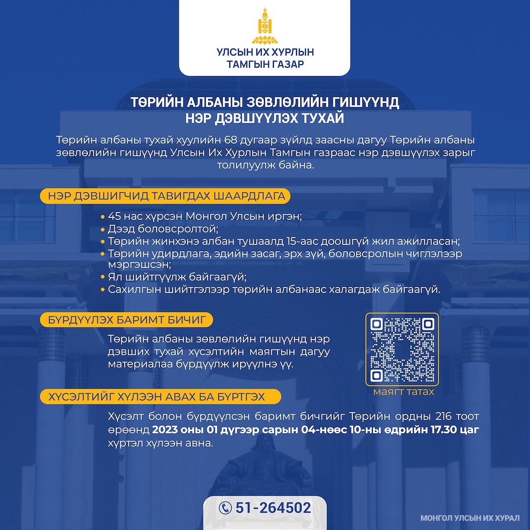 | Төрийн албаны зөвлөлийн гишүүнд нэр дэвшүүлэх тухай зар |