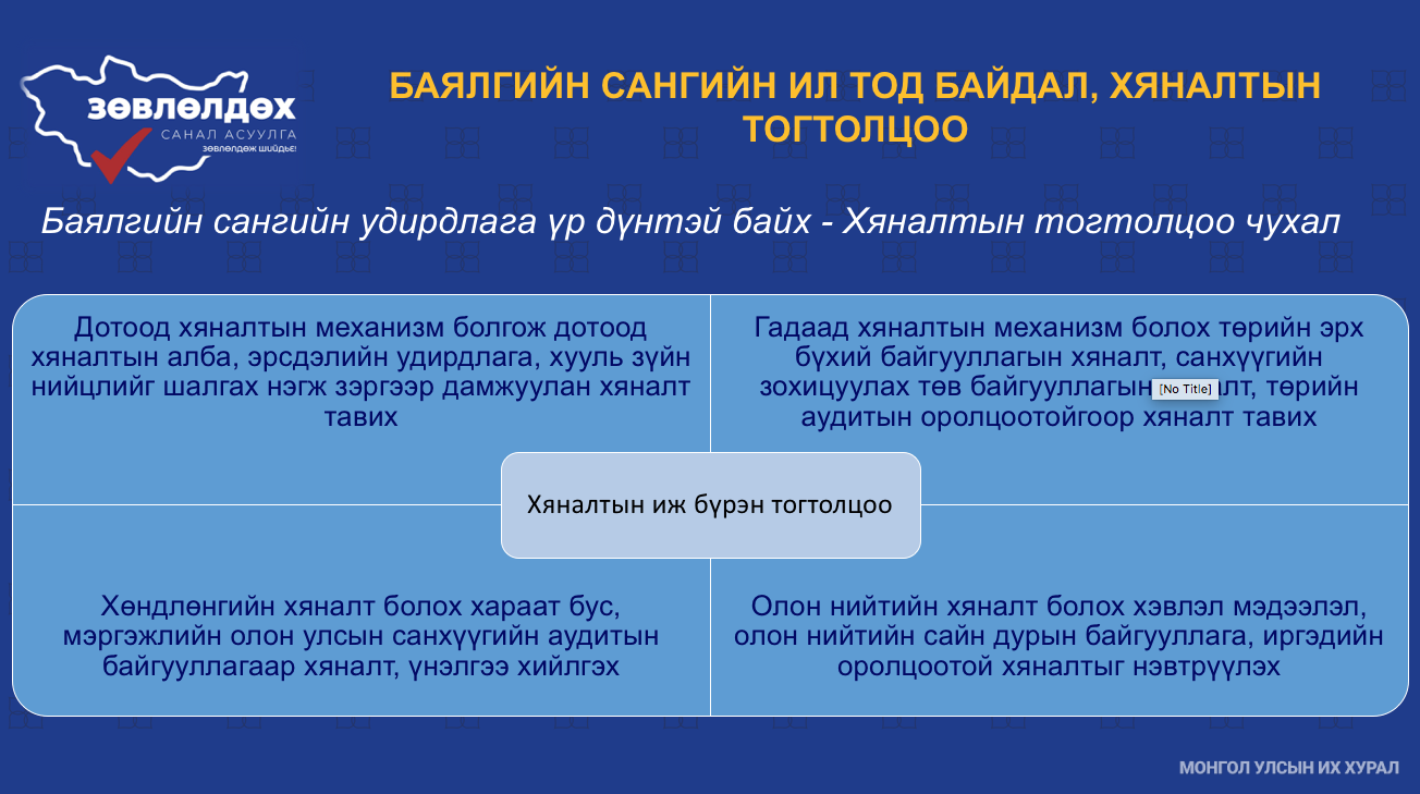 Бидний хувьд олон улсын сайн туршлагыг нэвтрүүлж мэргэжлийн баг удирдсанаар тухайн сангийн эх үүсвэрээр улс орныхоо хөгжилд нэн шаардлагатай төслүүдийг санхүүжүүлэх боломж бүрдэнэ. Нөгөөтээгүүр, сангийн удирдлагыг ил тод, зөв сонгож чадахгүй нөхцөлд улс төрөөс хараат бус байх байдал алдагдах сул талтайг онцлов.Баялгийн санд иргэдийн хяналтыг хэрэгжүүлэхэд мэдээллийн ил тод байдал чухал. Ийм механизмыг бүрдүүлж чадаагүй тохиолдолд хэчнээн мэргэжлийн баг ажиллууллаа ч энэ асуудлыг шийдвэрлэх боломжгүй гээд үндэсний баялгийн сангийн удирдлагын баг нь улс төрөөс хараат бус бөгөөд мэргэжлийн байж, олон нийтийн хяналтад ил тодоор ажиллах шаардлагатай гэж байлаа.