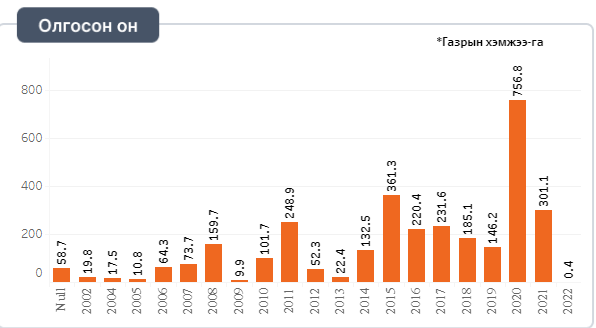Уг мэдээллээс харахад 2020 онд хамгийн өндөр буюу 756.8 га тусгай хамгаалалттай газарт зөвшөөрөл олгожээ. Тухайн үед БОАЖ-ын сайдаар УИХ-ын гишүүн Д.Сарангэрэл ажиллаж байсан. Тодруулбал, түүний хувьд 2020 оны долдугаар сараас 2021 оны хоёрдугаар сар хүртэл БОАЖ-ийн сайдаар ажилласан юм.
