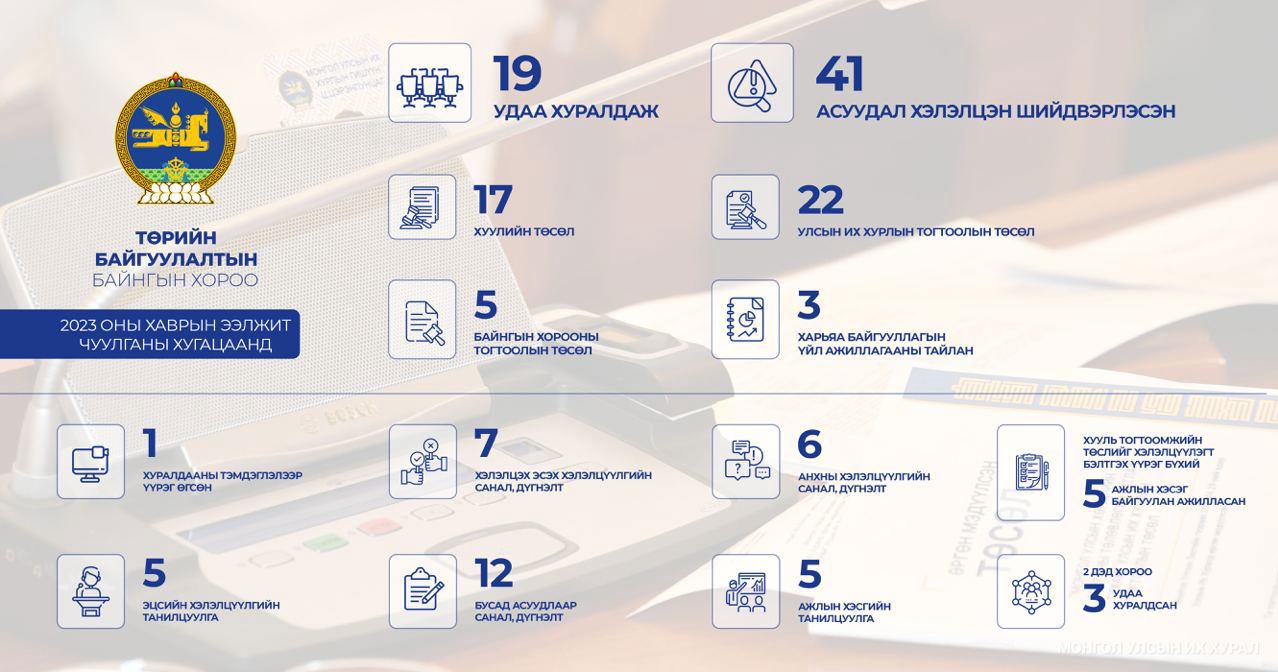 | Төрийн байгуулалтын байнгын хороо 17 хууль, УИХ-ын 22 тогтоол хэлэлцүүлэн батлуулжээ |