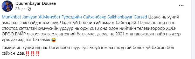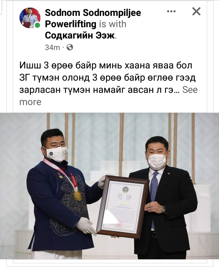 Мөн “Токио-2020” зуны олимп, паралимпын наадамд амжилттай оролцож, алтан медаль хүртсэн Хөдөлмөрийн баатар, гавьяат тамирчин Э.Содномпилжээд Засгийн газраас 120 сая төгрөг, гурван өрөө байрны батламж гардуулсан. Гэвч өнөөдрийг хүртэл бай, шагналаа олгоогүй талаар тэрбээр өөрийн цахим хаягаараа дамжуулан мэдэгдээд буй.