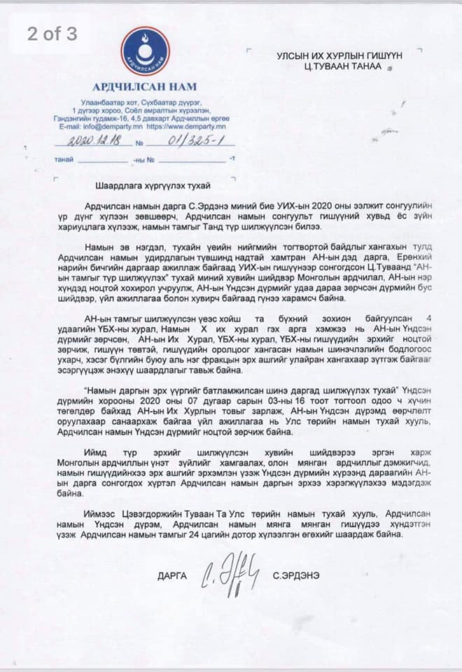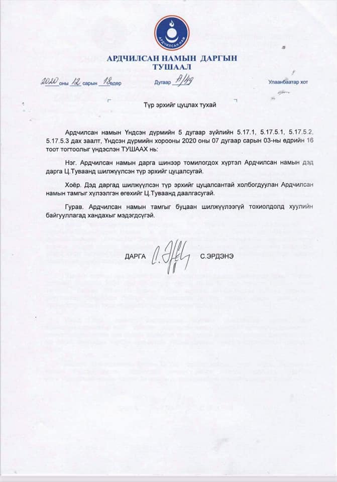 | С.Эрдэнэ: Ц.Туваан Ардчилсан намын тамга тэмдэгийг 24 цагийн дотор хүлээлгэж өгөх хэрэгтэй |