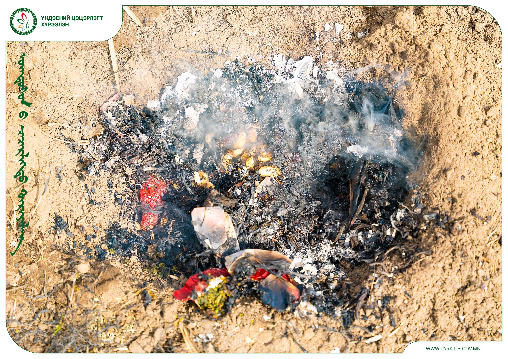 Энэ талаар Үндэсний цэцэрлэгт хүрээлэнгээс өөрийн цахим хаягаараа дамжуулж "Өнөөдөр Үндэсний цэцэрлэгт хүрээлэнд зориудаар гал тавьсан үйлдэл гарлаа. Цэцэрлэгт хүрээлэнгийн талбайд үл таних хүн шашны зан үйл хийж зориуд гал тавилаа. Хүрээлэнгийн ажилтнууд шуурхай ажиллаж галыг бага дээр нь түргэн унтрааж, дээрх хүний мэдээллийг цагдаагийн байгууллагад хүлээлгэн өгсөн болно. Иргэд та бүхэн ногоон байгууламж, нийтийн өмчид ариг гамтай хандахыг хүсье. Мөн хогоо хогийн саванд хаяж, ногоон байгууламжийг сүйтгэхгүй байхыг чинь сэтгэлээсээ хүсэж байна" хэмээн мэдэгджээ.