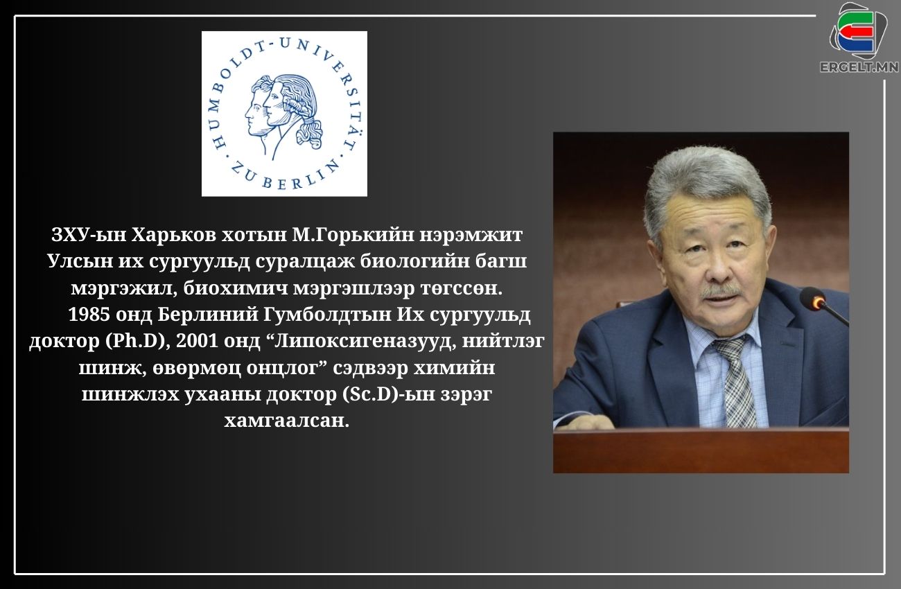 1985 онд Берлиний Гумболдтын Их сургуульд доктор (Ph.D), 2001 онд “Липоксигеназууд, нийтлэг шинж, өвөрмөц онцлог” сэдвээр химийн шинжлэх ухааны доктор (Sc.D)-ын зэрэг хамгаалсан. 2002 онд ШУА-ийн гишүүнээр сонгогдсон байдаг.