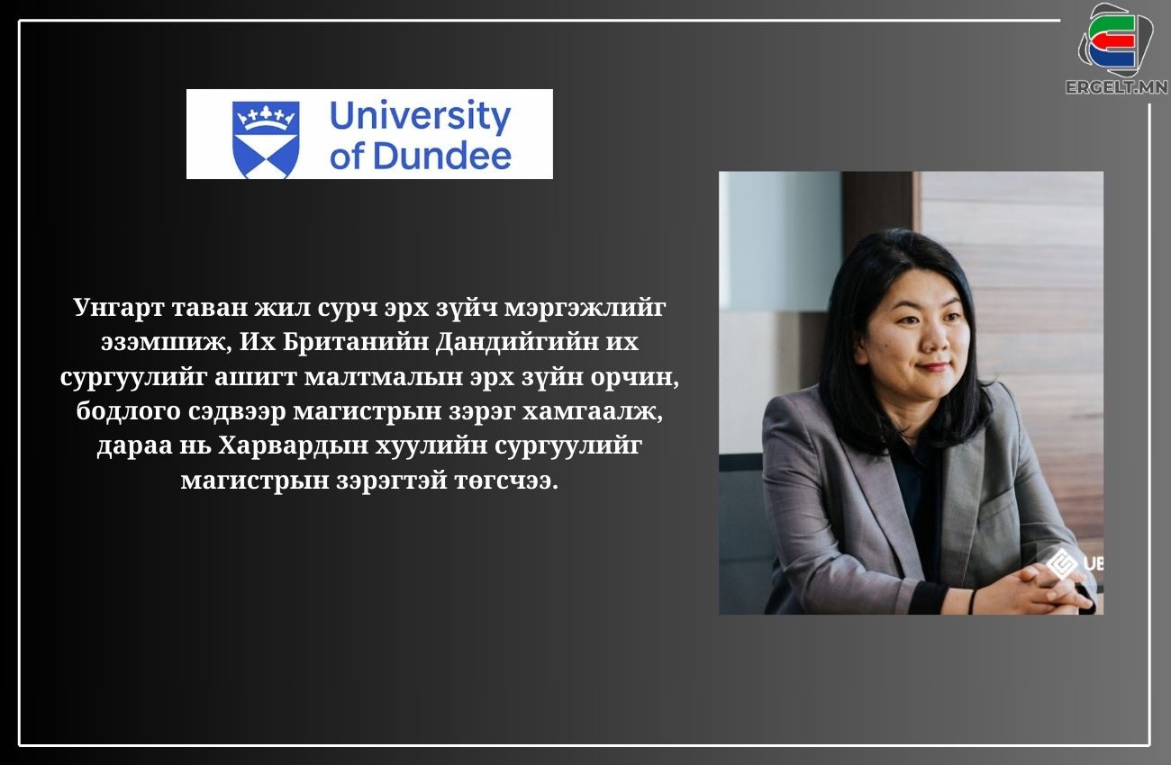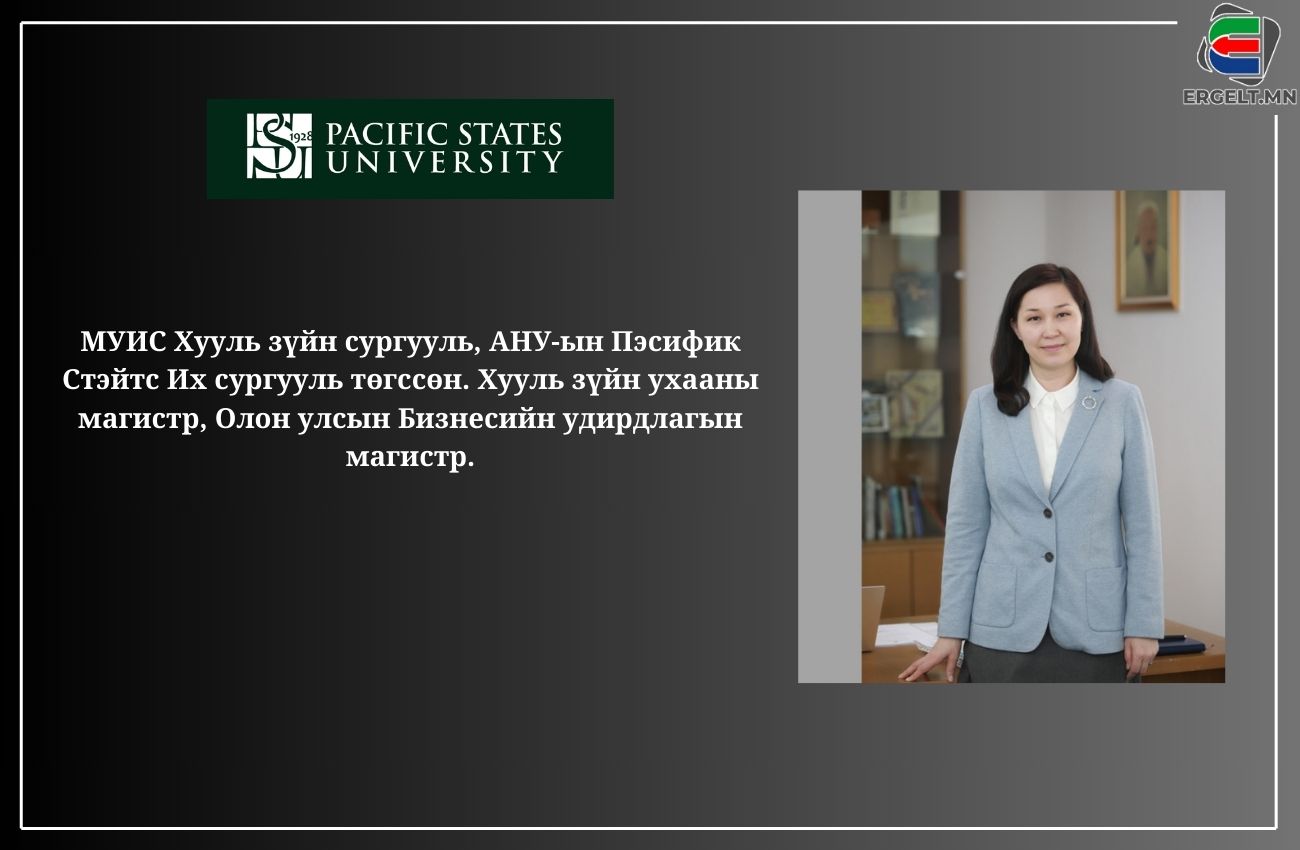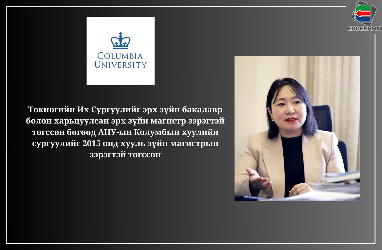 Хууль зүй, дотоод хэргийн дэд сайд Б.Солонгоо. Унгарт таван жил сурч эрх зүйч мэргэжлийг эзэмшиж, Их Британийн Дандийгийн их сургуулийг ашигт малтмалын эрх зүйн орчин, бодлого сэдвээр магистрын зэрэг хамгаалж, дараа нь Харвардын хуулийн сургуулийг магистрын зэрэгтэй төгсчээ. Мөн тэрбээр Олон улсын “Хоган Ловеллс” хуулийн фирмд ажиллаж багагүй туршлага хуримтлуулсан.