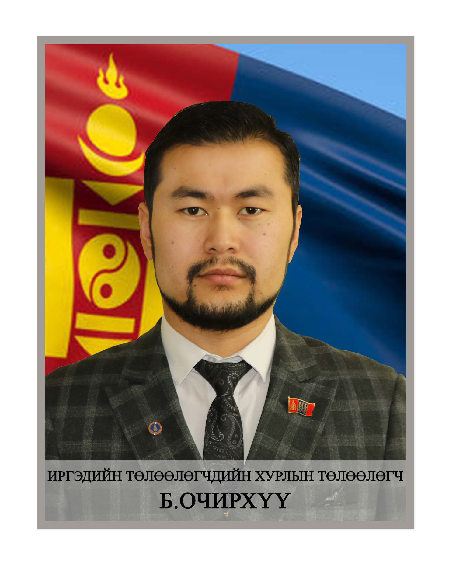 ИТХ-ын төлөөлөгч Б.Очирхүү- Дорноговь аймгийн Сүмбэр суманд төрсөн 1989 онд төрсөн. Говьсүмбэр аймгийн нэгдүгээр сургуулийг төгсөж, ХААИС-д цахилгааны инженерээр суралцаж, төгсжээ. Сургуулиа төгссөн даруйд Говьсүмбэр аймгийн Сүмбэр сумын II багийн Засаг даргаар ажиллаж, сумынхөө ИТХ-д сонгогдон ажилласан байна. Мөн тэрбээр Говьсүмбэр аймгийн Залуучуудын холбооны тэргүүн, Ардчилсан намын хорооны гишүүн гэх сонгуульт ажил эрхэлж байсан. Түүний намтар түүхээс харахад хувьдаа бизнесгүй хэр нь Говьсүмбэр аймгийн төлөөлөгчөөр суух хугацаанд хөрөнгө орлого нь огцом нэмэгдсэн байна. Тодруулбал, 2017 онд Сүмбэр сумын Засаг даргаар ажиллаж байх хугацаандаа жилийн орлого нь 8.6 сая төгрөг, гэр бүлийн орлого нь мөн 8.6 сая хэмээн мэдүүлж байжээ. Харин 2022 онд түүний өөрийн болон гэр бүлийн орлого нь огцом нэмэгдэж, жилийн орлого нь 238 сая төгрөг болсон бол гэр бүлийн орлого нь 26 сая төгрөг болж өссөн байна. Тэрбээр 24 сая төгрөгөөр үнэлэгдэх автомашин, 3.8 сая төгрөгийн үнэлгээ бүхий газартай хэмээн мөн хөрөнгө орлоготоо дурджээ.