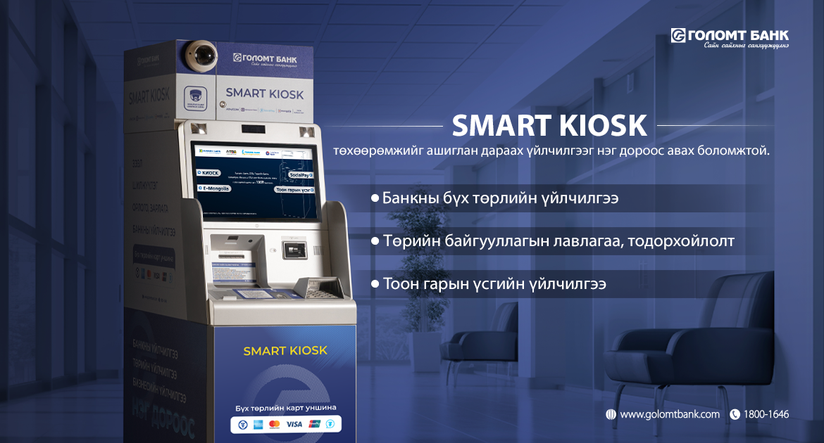 Харилцагчид өмнө нь ATM төхөөрөмжөөс зөвхөн банкны үйлчилгээ авдаг байсан бол төрийн байгууллагын үйлчилгээг хамт авах боломжийг бүрдүүлсэн Smart KIOSK төхөөрөмжийг Голомт банк Монгол Улсад анхлан нэвтрүүлээд байна. Энэхүү KIOSK төхөөрөмжийг хэрэглээнд нэвтрүүлснээр харилцагчид Голомт банк болон доор дурдсан төрийн байгууллагын үйлчилгээг орон нутаг, Улаанбаатар хотод байрлах 330 гаруй шинэчлэгдсэн ATM төхөөрөмжийг ашиглан өөрт ойроос авах таатай нөхцөл бүрдэж буй юм.