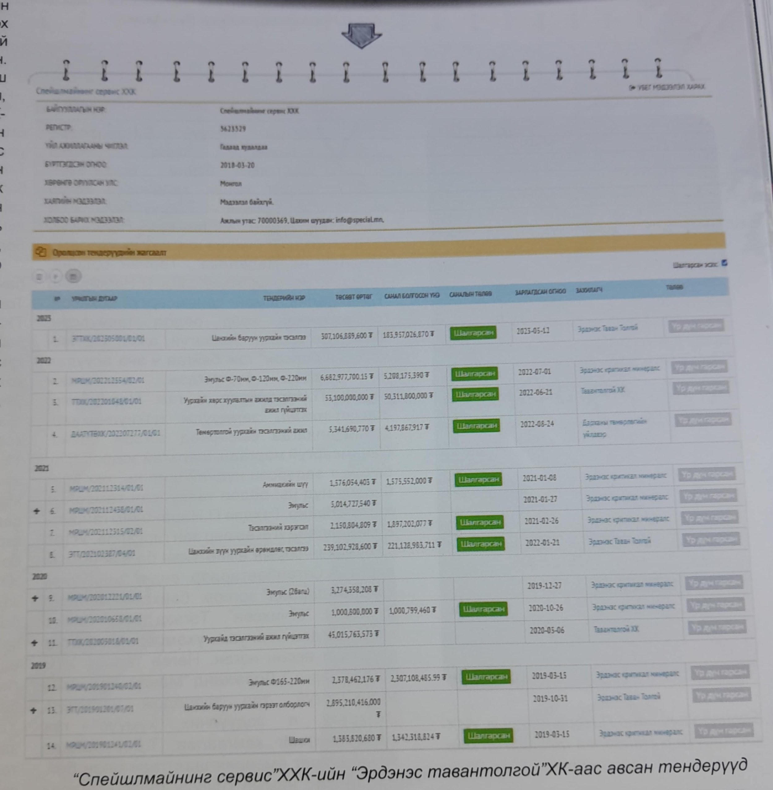 Ноцтой нь, УИХ-ын гишүүн Г.Уянгахишигийн гэр бүлийн бизнесийн хамтрагчид болох УИХ-ын гишүүн асан Б.Батбаярын хөвгүүдийн “Спейшл майнинг сервис” ХХК нь 2019 оноос хойш “Эрдэнэс тавантолгой” ХК-аас 1.7 их наяд төгрөгийн тендер аваад буй. Тухайлбал, “Спейшл майнинг сервис” ХХК нь