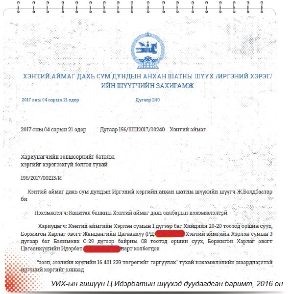 “Капитал” банк нэхэмжлэхдээ “Манай банкнаас 2014 оны тавдугаар сарын 14-нд 2040000008 тоот зээлийн болон барьцааны гэрээ байгуулан 40 сая төгрөгийн зээлийг 36 сарын хугацаатай, жилийн 24 хувийн хүүтэй зээлж авсан. Зээлийн гэрээний үүргийн баталгаа болгон дараах хөрөнгийг барьцаалсан. Зээлдэгч нар нь банктай байгуулсан зээлийн гэрээний эргэн төлөлтийн графикаа удаа дараалан зөрчин, зээлээ 2016 оны долдугаар сараас хойш төлөөгүйн улмаас зээлийн өрийн үлдэгдэл дараах байдалтай байна. Иймд хариуцагч Ж.Цагаанхүү, Ц.Идэрбат нараас 16,401,330 (Арван зургаан сая дөрвөн зуун нэг мянга гурван зуун гучин төгрөг) төгрөгийг хариуцагч нарын орлогоос гаргуулж банкыг хохиролгүй болгож өгнө үү. Шүүхийн шийдвэрийг сайн дураараа биелүүлээгүй тохиолдолд барьцаа хөрөнгөө; үүргийн гүйцэтгэлийг хангуулахаар шүүхийн шийдвэрт тусгаж өгнө үү” гэжээ.