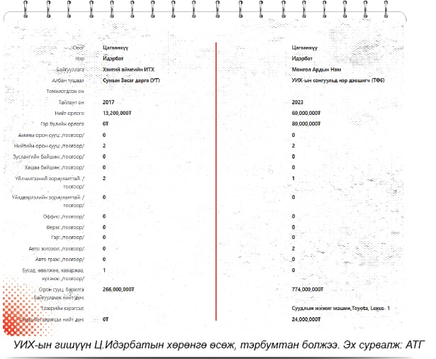 Ц.Идэрбат УИХ-ын гишүүнээр сонгогдсоныхоо дараа “огцом” баяжсан. Тэрбээр 2020 онд 266 сая төгрөгөөр үнэлэгдэх орон сууц, хашаа, байшинтай гэж хөрөнгөө мэдүүлсэн байдаг. Мөн өмчлөх эрхийн гурван газартай, дотоодын хадгаламждаа 15 сая төгрөгтэй, гэр бүлийн орлогоо 40 сая, өөрийн орлогоо 22 сая, нийт хөрөнгө нь 500 сая хүрэхгүй төгрөг гэж мэдүүлж байжээ. Гэтэл ганцхан жилийн дотор хөрөнгө нь тэрбум болж нэмэгдсэн. Тодруулбал, тэрбээр 2021 онд 795 сая төгрөгөөр үнэлэгдэх гурван орон сууц, хашаа, байшин, өвөлжөөтэй болжээ. Түүнчлэн жилийн орлогоо 122 сая, гэр бүлийн орлогоо 40 сая, дотоодын хадгаламж нь 41 сая төгрөг болж нэмэгдсэн байна. Ингэснээр нийт хөрөнгө нь тэрбум “хол” давж, төрөөс “төрсөн” тэрбумтнуудын эгнээнд 365 хоногийн дотор орсон байдаг.