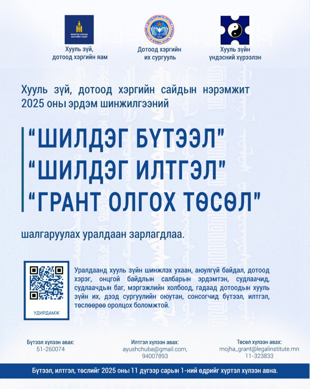 Хууль зүй, дотоод хэргийн сайдын нэрэмжит эрдэм шинжилгээний шилдэг бүтээл, илтгэл, грант олгох төсөл шалгаруулах уралдаан тав дахь жилдээ зарлагджээ.