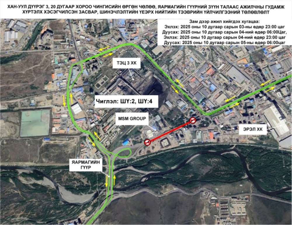 “МСМ групп" ХХК-ийн уулзвараас Лавай захын уулзвар хүртэлх замыг шөнийн цагаар хааж шугам сүлжээний ажил хийхтэй холбоотой шөнийн тээврийн хоёр чиглэлд түр өөрчлөлт орно. Хан-Уул дүүрэг, 2, 3-р хороо, Чингисийн өргөн чөлөө, Яармагийн гүүрний зүүн талаас Ажилчны гудамжны уулзвар хүртэлх авто замын өргөтгөл, шинэчлэлтийн ажлын хүрээнд "МСМ групп" ХХК-ийн уулзвараас Лавай захын уулзвар хүртэлх авто замыг шөнийн цагаар хааж цэвэр усны нэвтрэх сувагчлал байгуулах ажлыг хийж гүйцэтгэнэ. Зам хаахтай холбогдуулан шөнийн тээврийн ШҮ:2 “Сүхбаатарын талбай-Нисэх”, ШҮ:4 “Сүхбаатарын талбай-Чингис хаан ОУНБ” чиглэлийн замналд өөрчлөлт орж, ТЭЦ-3 замаар тойрч зорчихоор болсон байна.