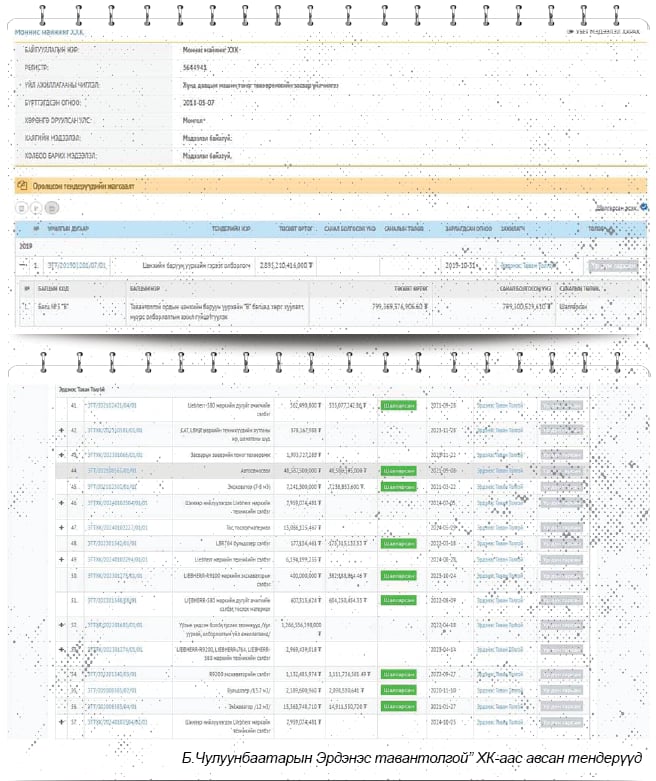 Мөн Б.Чулуунбаатарын “Моннис майнинг” ХХК нь 2019 онд “Эрдэнэс тавантолгой” ХК-ийн Тавантолгойн ордын цанхийн баруун уурхайн В хэсэгт хөрс хуулалт, нүүрс олборлолт хийх 799 тэрбум төгрөгийн тендерт шалгарсан байдаг. Цаашлаад, Б.Чулуунбаатарын “Майнс ап” ХХК нь “Эрдэнэс тавантолгой” ХК-аас 2021 онд 57 тэрбум, 2022 онд 250 тэрбум, 2023 онд таван тэрбум, 2024 онд найман тэрбум гэх мэтээр жил бүр хэдэн арван тэрбум төгрөгийн тендер авч ирсэн. Тиймдээ ч Б.Чулуунбаатар УИХ-ын “Нүүрсний хулгай”-н хэргийн нээлттэй сонсголд дуудагдсан.