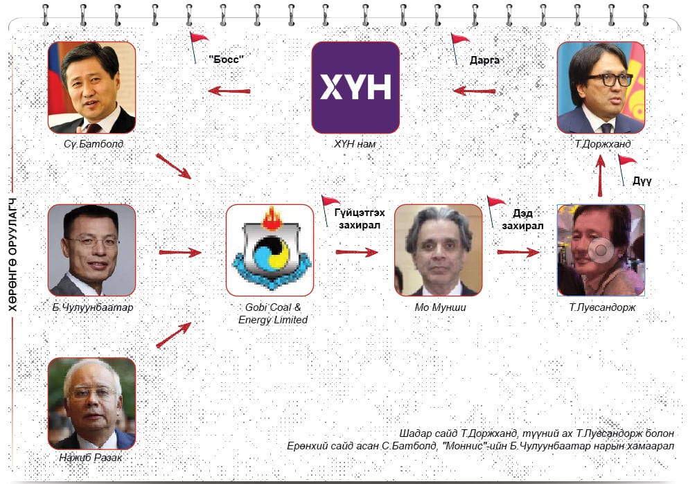Харин Сү.Батболд, “Моннис”-ийн Б.Чулуунбаатар хоёрын хувьд, хоёулаа ааваараа Сүхбаатар аймгийн Сүхбаатар сумынх. Тиймдээ ч Сү.Батболд, Б.Чулуунбаатар хоёр Сүхбаатарын уугуул У.Хүрэлсүх, Б.Жавхлан хоёртой хамтран “Дамдины Сүхбаатар” санг байгуулж, хамтран удирдаж ирсэн. Мөн “Тавантолгой”-н бүлэг ордыг анх Сү.Батболд эзэмшиж байгаад Б.Чулуунбаатар, Ж.Оджаргал хоёртой хамтран “Энержи ресурс” ХХК-ийг байгуулсан түүхийг бид мэднэ. Тэгэхээр Сү.Батболд 2011 онд Малайзын Ерөнхий сайд Нажиб Разакийн мөнгийг “Гобикоул энд энержи” ХХК-аар дамжуулан “угаах” ажилдаа Б.Чулуунбаатарыг хамтрагчаараа сонгосон нь ойлгомжтой асуудал юм. Нэгтгэвэл, Т.Доржхандын төрсөн ах Т.Лувсандорж нь Сү.Батболд, “Моннис”-ийн Б.Чулуунбаатар, Малайзын Ерөнхий сайд Нажиб Разак гурвын оффшороос оруулж ирсэн мөнгийг “Гобикоул энд энержи” ХХК-аар дамжуулан “угаах” ажлыг гардан хариуцаж байсан болж таарч байгаа юм.