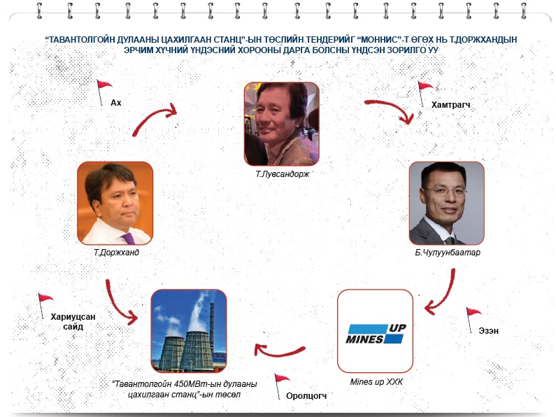 “Моннис”-ийн Б.Чулуунбаатар “Тавантолгойн 450МВт-ын дулааны цахилгаан станц”-ын төслийн тендер өмнө нь оролцоод ялагдсан юм чинь дахин зарлахад нь даагаа нэхэж таарна. Харин дахин тендер зарлах, шалгаруулах хүн нь эрх, үүргээрээ Засгийн газрын Эрчим хүчний үндэсний хорооны дарга бөгөөд Гадаад худалдаа, хөрөнгө оруулалт хариуцсан Шадар сайд Т.Доржханд. Ноцтой нь, Т.Доржхандын төрсөн ах Т.Лувсандорж нь “Моннис”-ийн Б.Чулуунбаатартай хоёр компаниар нэгдмэл ашиг сонирхолтой гэдгийг дээр баримтаар танилцуулсан. Тэгэхээр УИХ-ын гишүүн Б.Энхбаяр Т.Доржхандыг “Тавантолгойн 450МВт-ын дулааны цахилгаан станц”-ын төслийн тендерийг бие даан зохион байгуулж, улмаар “Моннис”-ийн Б.Чулуунбаатарыг “Майнс ап” ХХК-ийг шалгаруулах “хор найруулж” байна гэж битүүхэн хэлсэн болж таарч байгаа юм.
