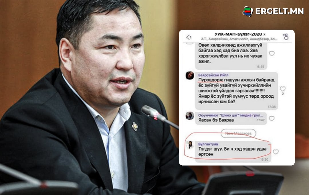 УИХ-ын гишүүн асан Б.Баярсайхан “УИХ-МАН-Бүлэг-2020” групп чат дээр “Б.Пүрэвдорж гишүүн ажлын байранд ёс зүйгүй, увайгүй хүчирхийлэлийн шинжтэй үйлдэл гаргалаа. Ямар ёс зүйтэй хүмүүс төрд ороод ирчихсэн юм бэ” хэмээн бичиж байжээ. Түүнд нь УИХ-ын дэд дарга Б.Булгантуяагийн “Тэгдэг шүү. Би ч хэд хэдэн удаа өртсөн” хэмээн бичиж байсан чат нь өнөөдөр олон нийтийн сүлжээнд ил боллоо. Энэ талаар УИХ-ын гишүүн Б.Пүрэвдоржтой холбогдож, тодруулахаар гар утас руу нь залгахад түүний туслах тайлбар өглөө.