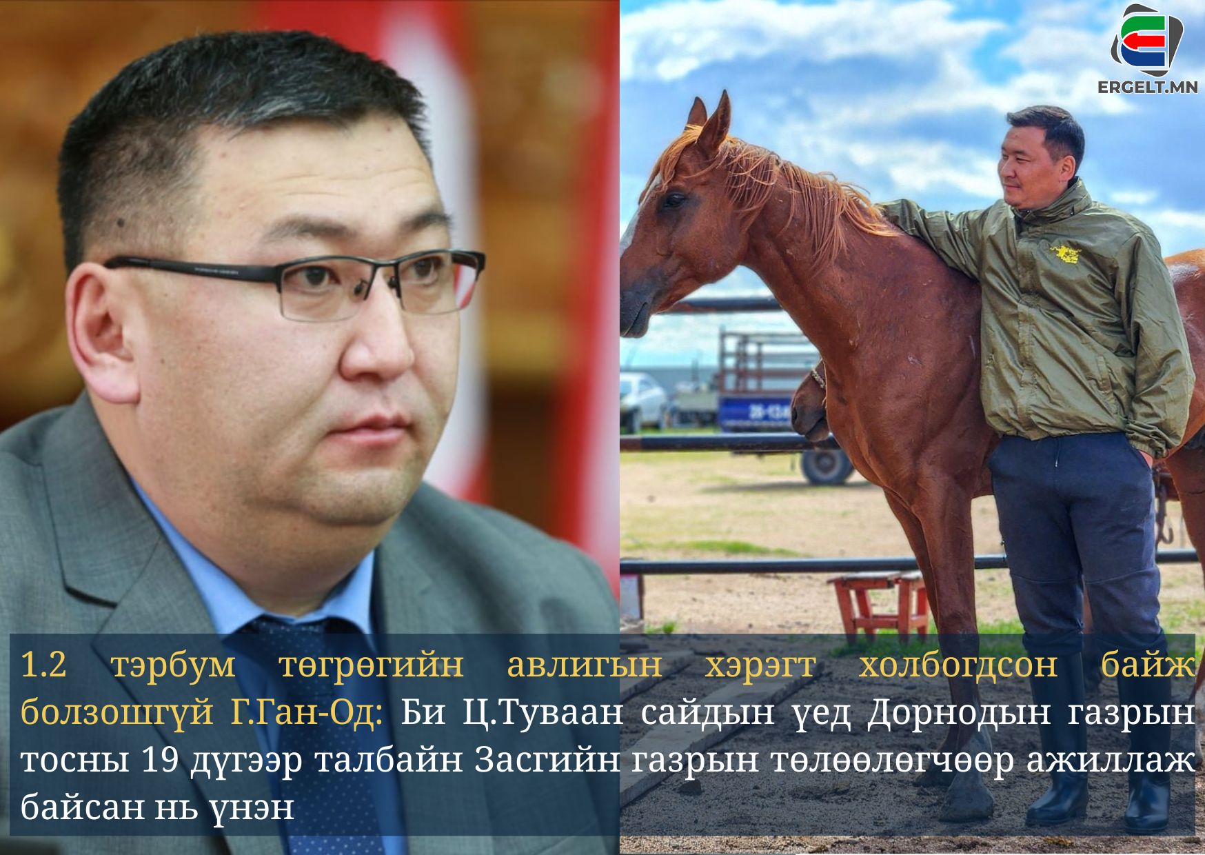 | 1.2 ТЭРБУМ ТӨГРӨГИЙН АВЛИГЫН ХЭРЭГТ ХОЛБОГДСОН ГЭХ Г.ГАН-ОД: БИ Ц.ТУВААН САЙДЫН ҮЕД ДОРНОДЫН ГАЗРЫН ТОСНЫ 19 ДҮГЭЭР ТАЛБАЙН ЗАСГИЙН ГАЗРЫН ТӨЛӨӨЛӨГЧӨӨР АЖИЛЛАЖ БАЙСАН НЬ ҮНЭН |