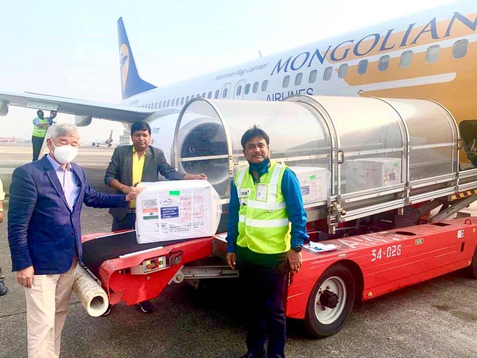 БНЭУ-аас Монгол Улсад буцалтгүй тусламжаар олгож буй АстраЗенека вакины эхний таталт болох 150 мянган тун Мумбай хотоос өнөө өглөө 06:20 цагт Буянт-Ухаа олон улсын нисэх буудалд газардлаа.