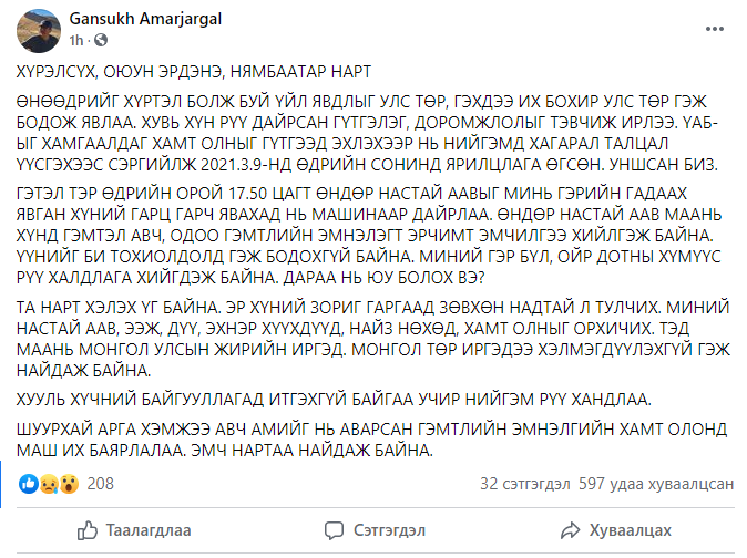Гэтэл тэр өдрийн орой 17:50 цагт өндөр настай аавыг минь гэрийн гадаах явган хүний гарц гарч явахад нь автомашинаар дайрлаа. Өндөр настай аав маань хүнд гэмтэл авч, одоо гэмтлийн эмнэлэгт эрчимт эмчилгээ хийлгэж байна. Үүнийг би тохиолдолд гэж бодохгүй байна. Миний гэр бүл, ойр дотны хүмүүс рүү халдлага хийж байна. Дараа нь юу болох вэ.