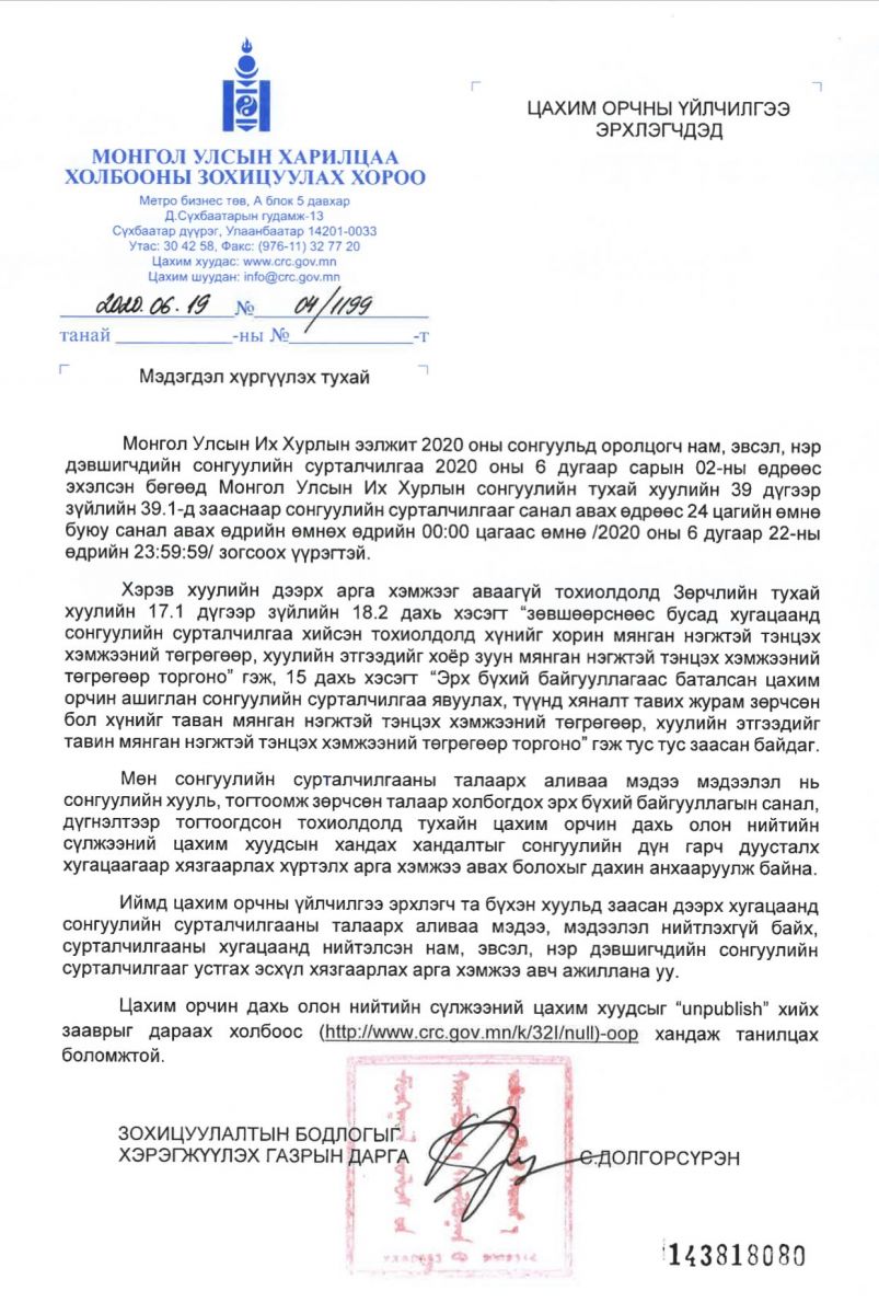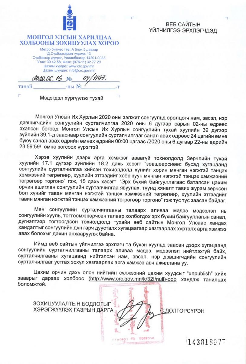 Монгол Улсын Их Хурлын ээлжит сонгуульд оролцогч нам, эвсэл, бие даан нэр дэвшигчдийн сурталчилгааг Монгол Улсын Их Хурлын сонгуулийн тухай хуулийн 39.1-д зааснаар санал авах өдрөөс 24 цагийн өмнө буюу санал авах өдрийн өмнөх өдрийн 00:00 цагаас /2020 оны 6 дугаар сарын 22-ны өдрийн 23:59:59/ өмнө зогсоох үүргээ хэрэгжүүлж, сонгуулийн сурталчилгааны талаарх аливаа мэдээлэл нийтлэхгүй байх, сурталчилгааны хугацаанд нийтэлсэн нам, эвсэл, нэр дэвшигчдийн сонгуулийн сурталчилгааг устгах эсхүл хязгаарлах арга хэмжээ авч ажиллахыг мэдэгдэж байна.