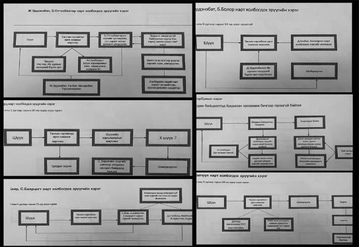 Тухайлбал, Г.Эрдэнэбат “Сүүлд өмгөөлөгч Б.Баасанцогтын компьютерээс баримт задарч, дуулиан боллоо. Тэрний өмнө надад маш том хардлага байсан. Юу гэхээр, намайг 2020 оны тавдугаар сарын 27-нд яллагдагчаар татсан. Намайг мөрдөн байцаагч дуудаад “Та энэ хэргийг зохион байгуулсан байна” гэхэд би зөвшөөрөөгүй. “Та нар ийм ийм баримтыг нэмж авч өгөөчээ, үүнийхээ дараа намайг буруутгах эсэхээ шийд. Та нарын цуглуулсан баримт дотор миний баталсан тогтоол, гаргасан шийдвэр, прокурорын зөвшөөрөл гэх мэт зүйлс алга аа. Би ямар ямар зөвшөөрөл өгсөн, ямар тогтоол баталсныг тагнуулын байгууллагаас аваад баримтдаа хавсарга” гээд хүсэлт гаргасан. Тэр ажил ерөөсөө хийгдээгүй. Зургаадугаар сарын 5-нд намайг дахиж дуудаж байцаалт авсан. Би нөгөө л “Ийм ийм баримтыг шалгаж өгөөчээ” гэдэг зүйлийг ярьсан. Мэдүүлгээ өгөөд харих гээд зуслангийн зам дээр явж байтал мөрдөн байцаагч араас утасдаад “Би нэг зүйл дээр таны гарын үсгийг дутуу үлдээсэн байна” гэсэн. Ингээд зам зуур намайг зогсоож үлээлгээд, энэ хооронд мөрдөн байцаагч араас хүрээд ирсэн. Тэр гарын үсэг зуруулах зүйл нь намайг прокурорт шилжүүлэх тухай мөрдөгчийн санал байсан. Ингээд би ерөөсөө тав хоногийн дотор мөрдөгдөөд, яллагдагчаар татагдаж мөрдөн байцаалтын шатанд ажлын тав хоног оролцоод хэрэг маань прокурорт шилжсэн. Ингээд зургаадугаар сарын 5-нд прокурорт шилжсэн чинь 8-нд нь яллах дүгнэлттэйгээ танилц гээд прокурор дуусан. Уг нь журмаараа бол прокурор хэргийг аваад уншиж судлаад, яллах дүгнэлтээ бичдэг юм л даа. Надад 80 гаруй хуудас яллах дүгнэлт бичсэн байсан. Миний хэргийн 40 хуудас материалыг зогсоо зайгүй уншаад 80 хуудас яллах дүгнэлт бичхэд миний бодлоор сар гаруй болно.| Г.Эрдэнэбат: Б.Хурц нарын хэрэг Б.Баасанцогтын схемээр явсан юм байна |