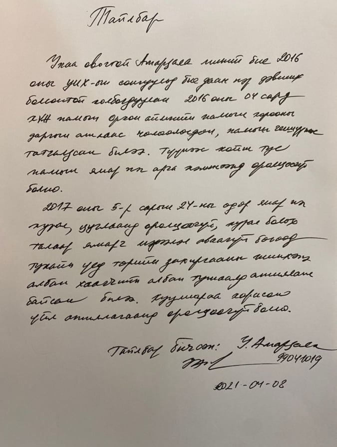 2016 оны дөрөвдүгээр сард Орхон аймгийн намын хорооны даргын албанаас чөлөөлөгдөж, УИХ-ын сонгуульд бие даан нэр дэвшихээр намын гишүүнээс татгалзсан байсан У. Амарзаяад өөрт нь ямар ч мэдээлэл өгөхгүйгээр Төв хорооны хурлын төлөөлөгчид оруулан бүртгэж УДШ-д баримт бүрдүүлэхдээ ашигласан нь илчлэгдлээ. У. Амарзаяа энэ тухай тайлбарыг өөрийн гараар бичиж өгсөн.