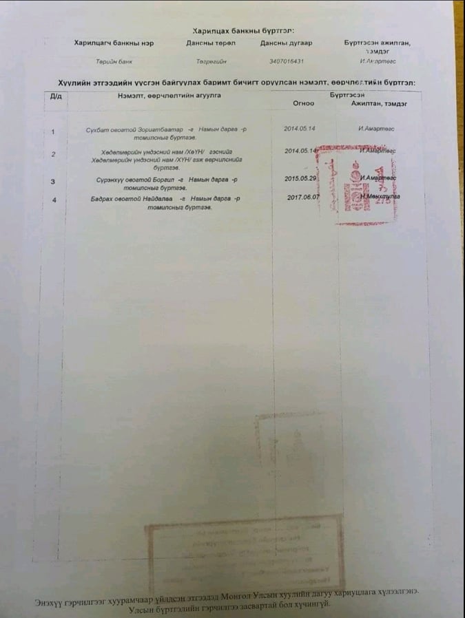 Б. Найдалаа нь Хан-Уул дүүргийн Иргэний хэргийн анхан шатны шүүхэд 2018 оны долдугаар сарын 03-ны өдөр намын 1116218993 тоот хяналтын дугаар бүхий тамганы дардас, 8082001019 тоот бүртгэлийн дугаар бүхий улсын бүртгэлийн гэрчилгээг гаргуулах нэхэмжлэлийг гаргасан. УДШ-д 2017 оны 05 дугаар сард бүртгүүлэхээр баримт бүрдүүлэн өгөхдөө, 1117243465 хяналтын дугаартай тамгыг ашигласан байна.