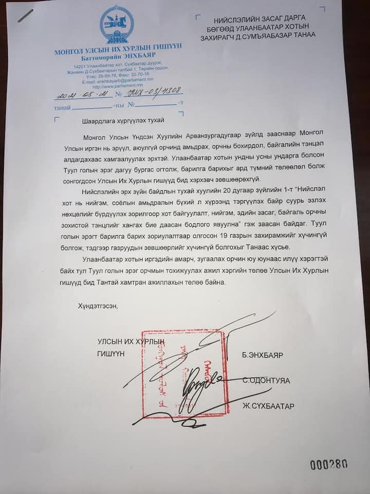 Тодруулбал, Туул голын эрэгт газар олгосон 19 газрын захирамжийг цуцлахаар албан бичиг хүргүүлж байгаа аж. Шаардлагадаа "Монгол Улсын Үндсэн хуулийн 16 дугаар зүйлд зааснаар Монгол Улсын иргэн нь эрүүл, аюулгүй орчинд амьдрах, орчны бохирдол, байгалийн тэнцэл алдагдахаас хамгаалуулах эрхтэй. Улаанбаатар хотын ундны усны ундарга болсон Туул голын эрэг дагуу бургас огтолж, барилга барихыг ард түмний төлөөлөл болж сонгогдсон УИХ-ын гишүүд бид хэрхэвч зөвшөөрөхгүй" гэжээ.