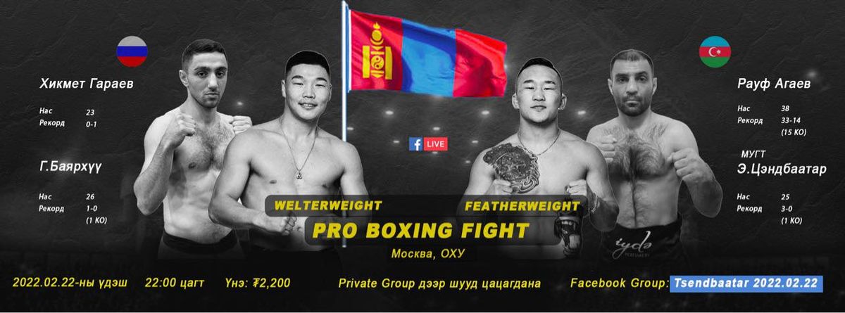 Өнөөдөр орой 22.00 цагт олон улсын хэмжээний мастер Г.Баярхүү ОХУ-ын 23 настай тамирчин Хикмет Гараевтай, гавьяат тамирчин Э.Цэндбаатар Азербайжан улсын 38 настай Рауф Агаевтэй тус тус тулалдах юм. Тус тоглолтыг “Tsendbaatar athlete” фэйсбүүк группээр шууд дамжуулах бөгөөд тоглолтыг үзэх сонирхолтой хүмүүс групптэй холбогдож, 2200 төгрөгийг шилжүүлэн үзэх боломжтой аж. Гавьяат тамирчин Э.Цэндбаатар “Өмнөх тулаанууд дээр би гоё боксын тоглолт үзүүлсэн, энэ удаад нокаут яаж хийдгээ үзүүлнэ. Гоё тоглолтыг үзүүлэхийн төлөө бид хоёр хичээнэ. Та бүхэн Монгол тамирчдаа дэмжээрэй” хэмээлээ.