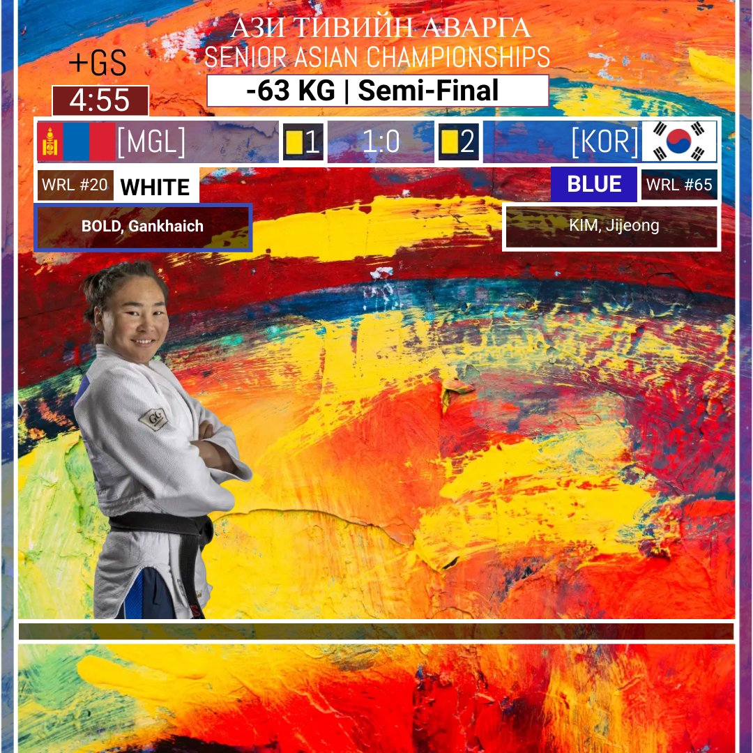 Ази тивийн аварга шалгаруулах тэмцээний 63 кг-ын жинд барилдсан ОУХМ Болдын Ганхайч аваргын алтан медалийн төлөө барилдахаар шалгарч үлдлээ. Б.Ганхайч хагас шигшээд Өмнөд Солонгосын жүдочин Ким Жи Жоныг ялсан. Б.Ганхайч аваргын алтан медалийн төлөө Японы бөх Нами Набекуратай орой 19.00 цагт барилдана.