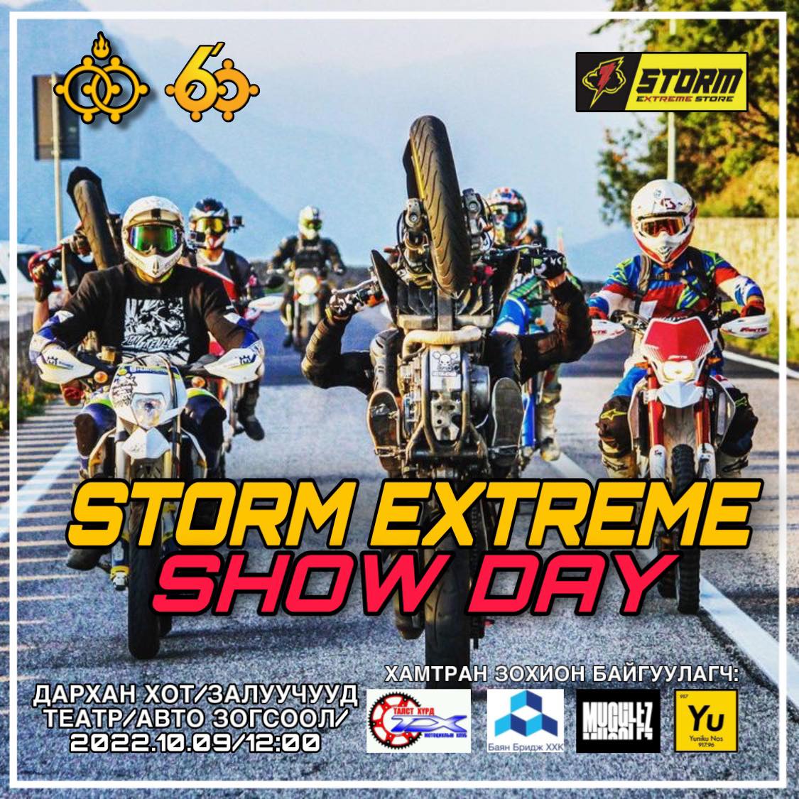 Дархан-Уул аймгийн Засаг даргын Тамгын газар болон “Storm” экстрим шоп хамтран экстрим спортын нээлттэй өдөрлөгийг зохион байгуулана. Тус өдөрлөгт Дархан хотын авто спорт, мото спорт, экстрим дугуй, скейт, роликоор хичээллэгч нийт залуучууд цугларч өөрсдийн үзүүлбэрээ үзүүлж, ижил сонирхолтой хүмүүстэй уулзах боломжтой юм.