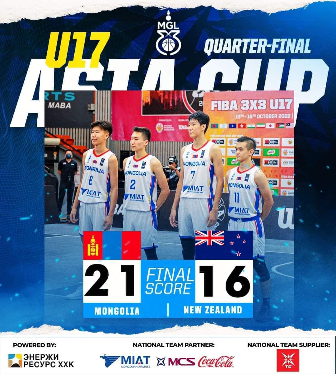 Малайз Улсын Куала Лумпур хотноо ФИБА 3x3 "U17" Ази тивийн аварга шалгаруулах тэмцээн үргэлжилж байна. Тус тэмцээнд оролцож буй манай хөвгүүд Шинэ Зеландын шигшээ багийн 21:16-ын харьцаатай хожиж шилдэг дөрөвт шалгарч үлдлээ.