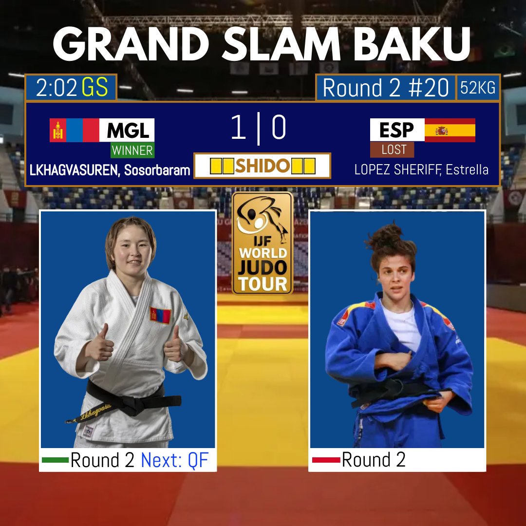 Баку 2022 жүдо бөхийн их дуулга тэмцээний үдээс өмнөх хэсгийн барилдаан үргэлжилж байна. Эмэгтэйчүүдийн 52 кг-ын жингийн эхний барилдаандаа ОУХМ Л.Сосорбарам, Сербийн Naddezda Petrovic-ийг ялсан. Харин тэрбээр дараагийн тойрогт Испанийн LOPEZ SHERIFF ESTRELLA-г ялж хэсгийн аваргын төлөө барилдах эрхтэй боллоо.