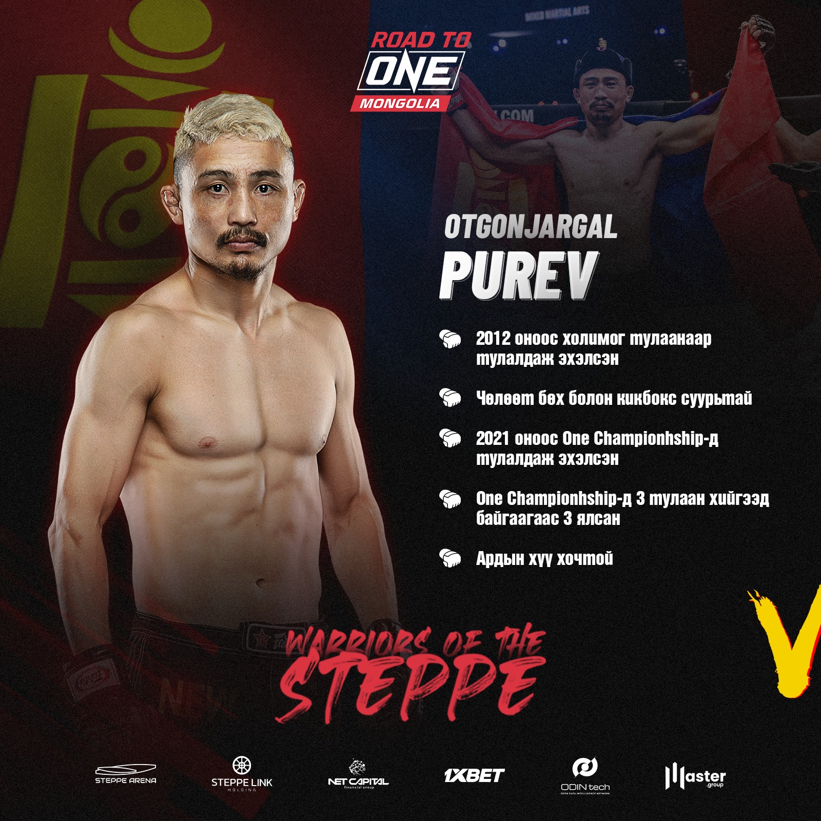 Холимог тулааны тамирчин “Ардын хүү” хочит О.Пүрэв анх удаа эх орныхоо дэвжээн дээр хөгжөөн дэмжигчдийнхээ өмнө “ONE Championship” -ийн албан ёсны тулаанаа хийнэ. Тулаанч О.Пүрэв, Индонезийн тамирчин Суното Перингкаттай энэ сарын 26-ны өдөр буюу “Тусгаар тогтнолын өдөр” тулаан хийх гэж байна. Тус тулаан “Мөсөн Өргөө” Steppe Arena-д болно