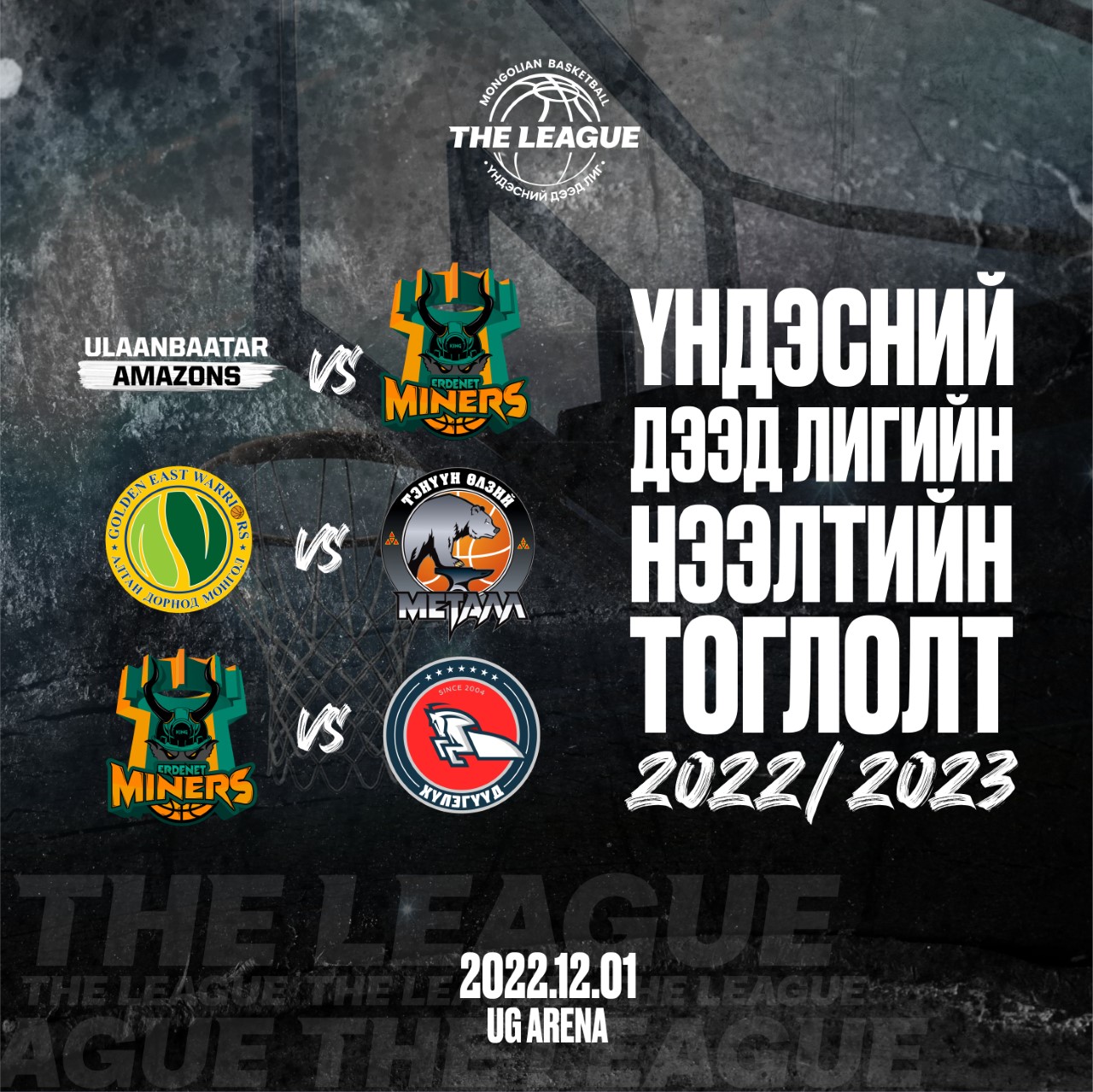 Монголын сагсан бөмбөгийн холбооны 2022-2023 оны Үндэсний дээд лигийн шинэ улирлын нээлтийн тоглолт арванхоёрдугаар сарын 1-ний өдөр “UG Arena” ордонд болох гэж байна. Нээлтийн тоглолтын хуваарь 16:00 цагт эмэгтэй багийн тоглолтоор эхэлнэ. “Улаанбаатар Амазонс” баг, Эрдэнэтийн “Уурхайчид” багтай тулна.